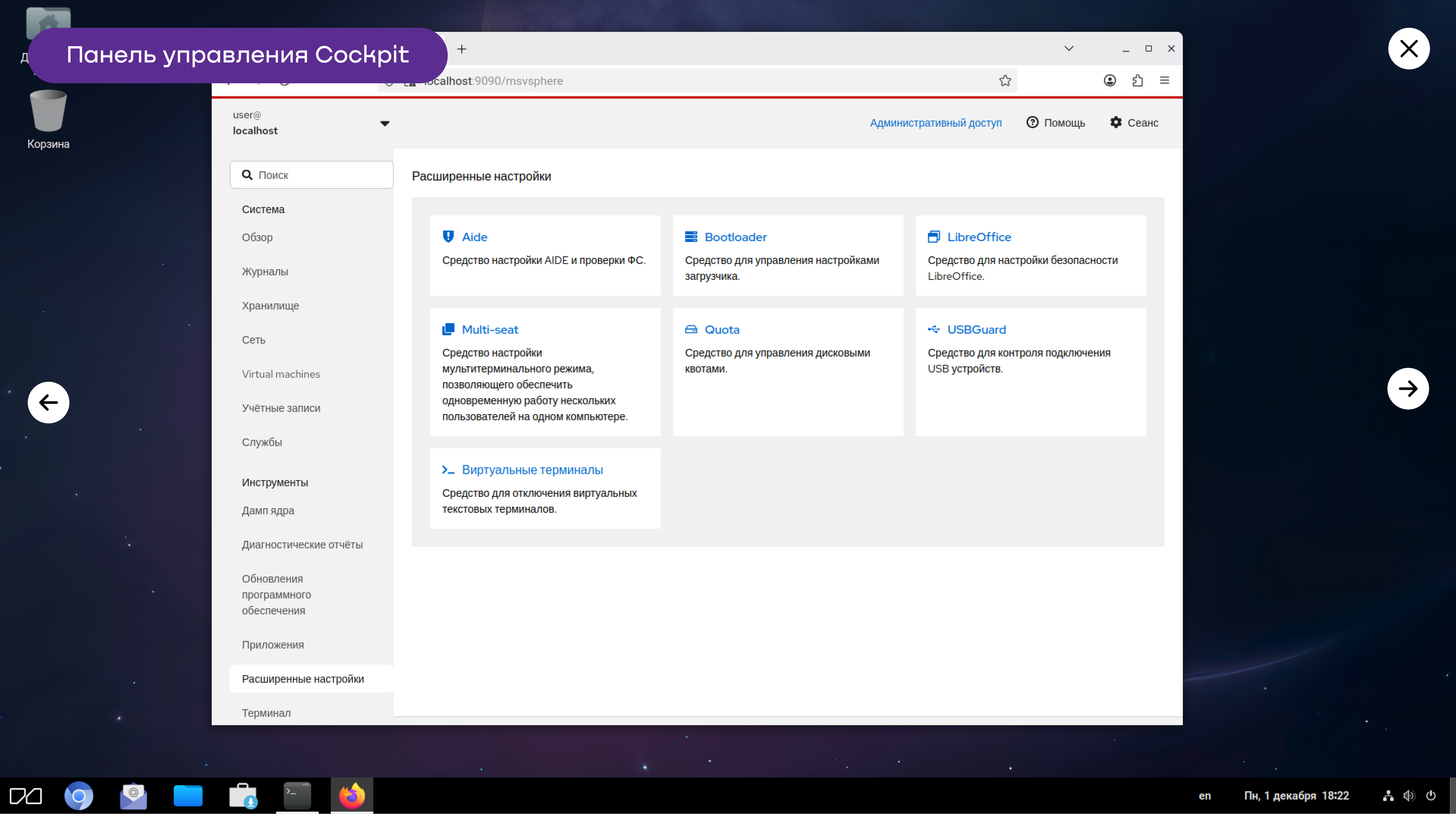 - Разработаны новые модули для Cockpit (управление параметрами загрузчика, дисковыми квотами, отключение макросов в LibreOffice, отключение виртуальных консолей)