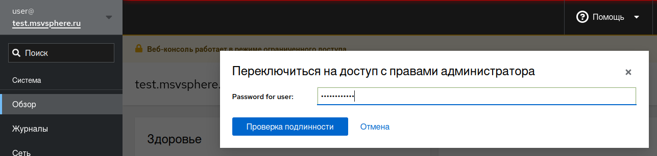 Cockpit, на странице «Обзор» нажмите кнопку «Включить доступ с правами администратора» или кнопку «Ограниченный доступ», которая также доступна на других страницах системы управления. На приведённом ниже снимке экрана эти кнопки обозначены красным прямоугольником: