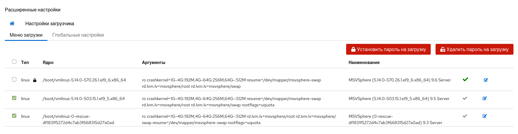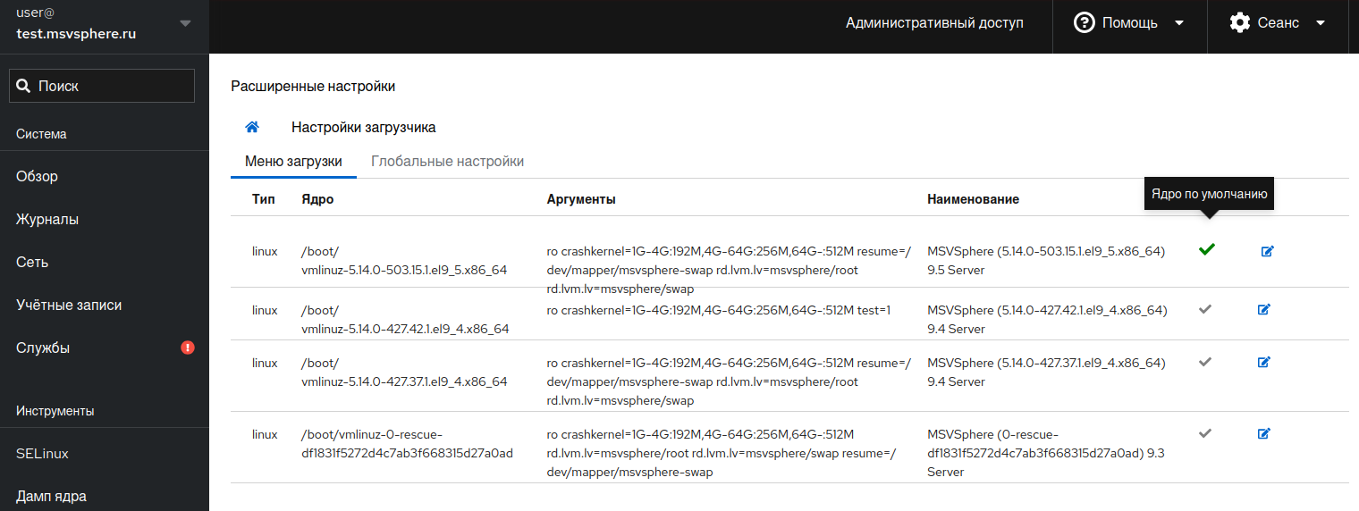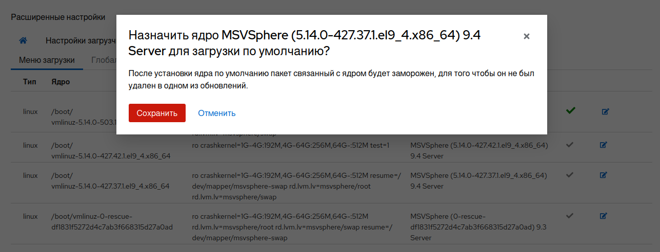 Для того чтобы изменить загружаемое ядро по умолчанию, нажмите иконку на соответствующей записи. После нажатия во всплывающем окне подтвердите свой выбор.