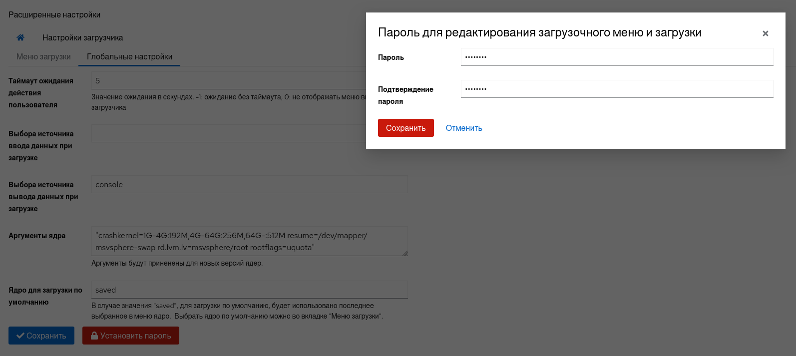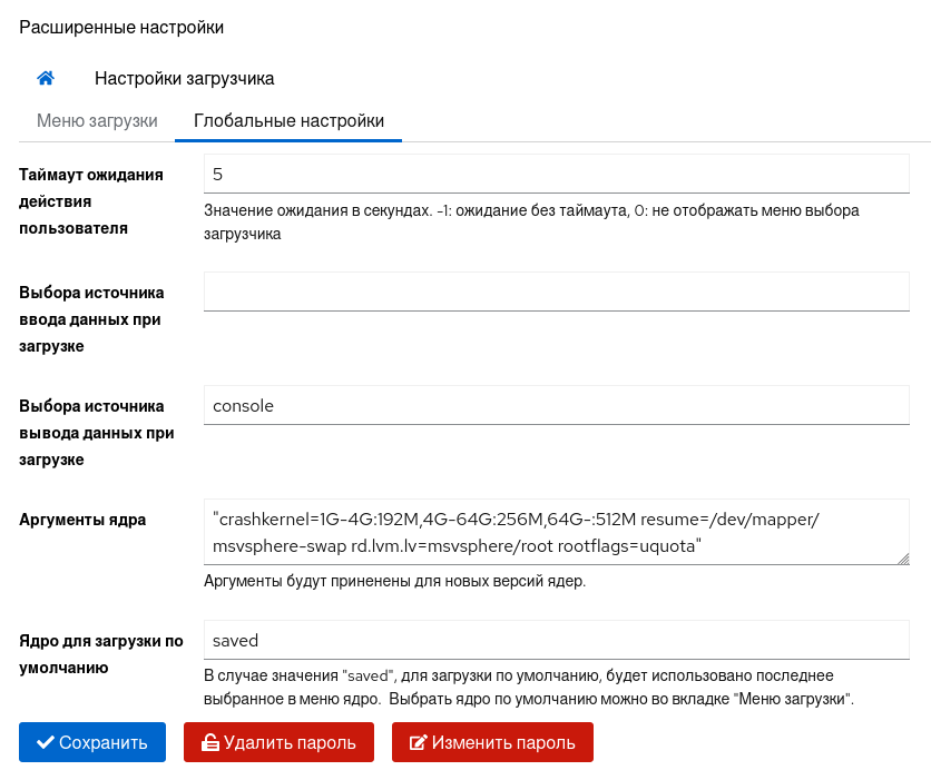В данном разделе представлена форма, позволяющая изменять некоторые глобальные настройки загрузчика путём модификации файла /etc/default/grub