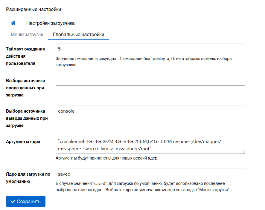 Таймаут ожидания действия пользователя— время ожидания действия в секундах. Значение-1— ожидание выбора без таймаута,0— не отображать меню выбора загрузчика.Выбора источника ввода данных при загрузке— терминальное устройство ввода. Здесь вы можете выбрать несколько устройств, разделенных пробелами. Допустимые названия терминалов ввода зависят от платформы, но могут включатьconsole(консоль собственной платформы),serial(последовательный терминал),serial_<порт>(последовательный терминал с явным выбором порта),at_keyboard(клавиатура PC AT) илиusb_keyboard(USB-клавиатура). По умолчанию используется собственный терминальный ввод платформы.Выбора источника вывода данных при загрузке— терминальное устройство вывода. Здесь вы можете выбрать несколько устройств, разделенных пробелами. Допустимые названия выходных данных терминала зависят от платформы, но могут включатьconsole(консоль собственной платформы),serial(последовательный терминал),serial_<порт>(последовательный терминал с явным выбором порта),gfxterm(вывод в графическом режиме),vga_text(текст VGA вывод),mda_text(вывод текста MDA),morse(кодировка Морзе с использованием системного звукового сигнала) илиspkmodem(простой протокол передачи данных с использованием системного динамика).Аргументы ядра— будут использоваться как аргументы по умолчанию при обновлении/установке новых ядер.Ядро для загрузки по умолчанию— в случае значенияsavedдля загрузки по умолчанию будет использовано последнее выбранное в меню ядро. Выбрать ядро для загрузки по умолчанию также можно во вкладке «Меню загрузки».