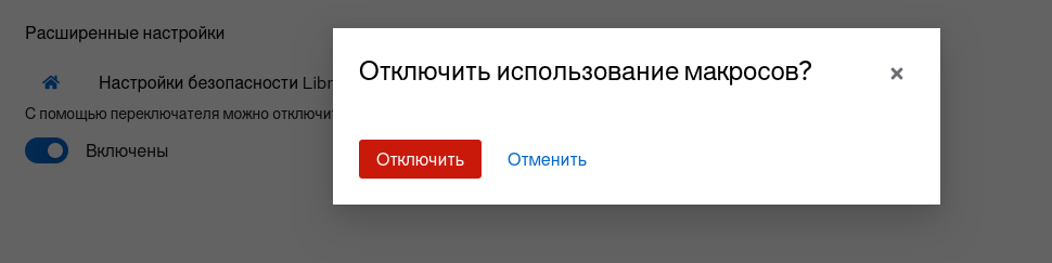 При отключении использования макросов будет показано окно подтверждения.