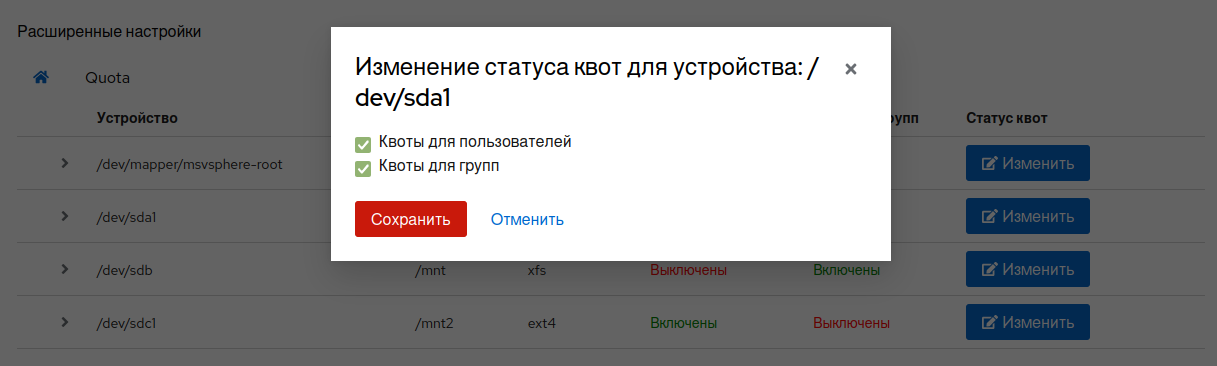 Для включения или выключения квот для пользователей/групп нажмите на кнопку «Изменить» для выбранной файловой системы. В открывшемся окне укажите нужный статус с помощью селекторов и сохраните изменения.