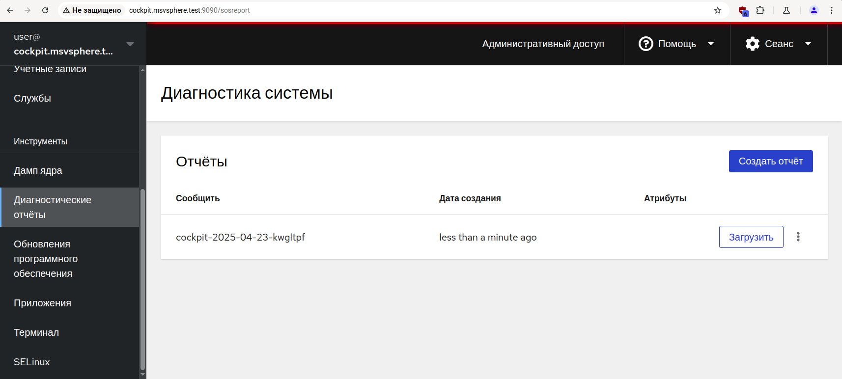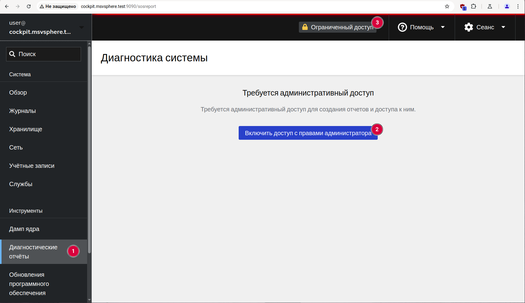 Для создания диагностического отчёта войдите в систему управления Cockpit и в левом навигационном меню выберите пункт «Диагностические отчёты» (отмечен цифрой 1 на снимке экрана).