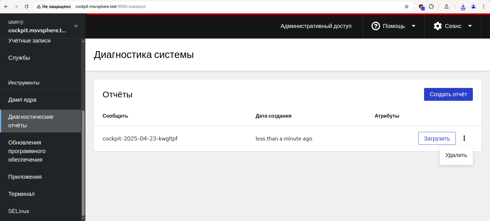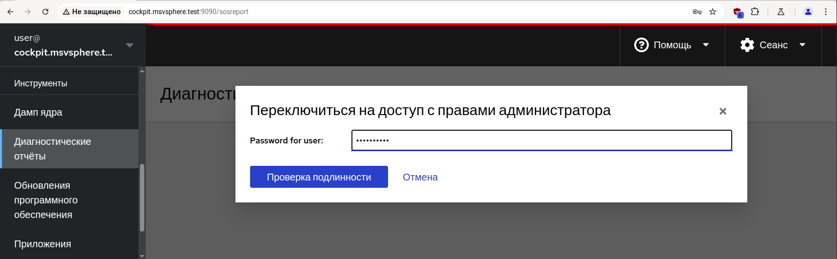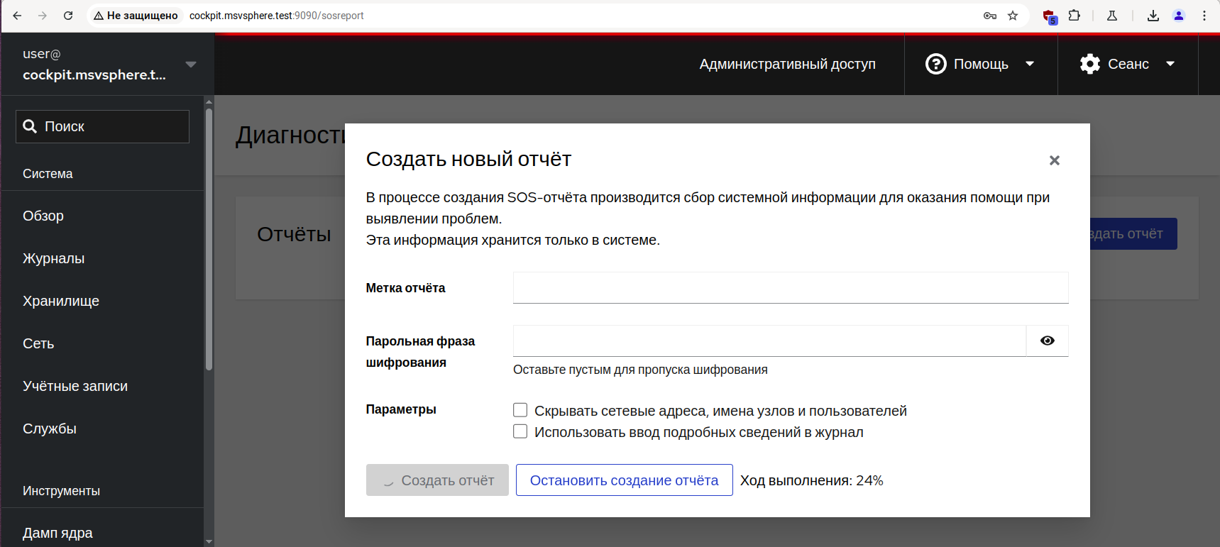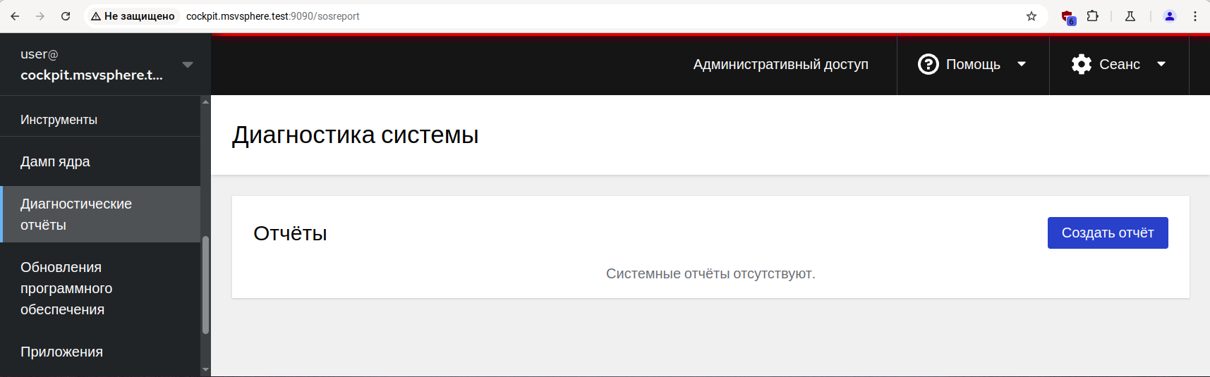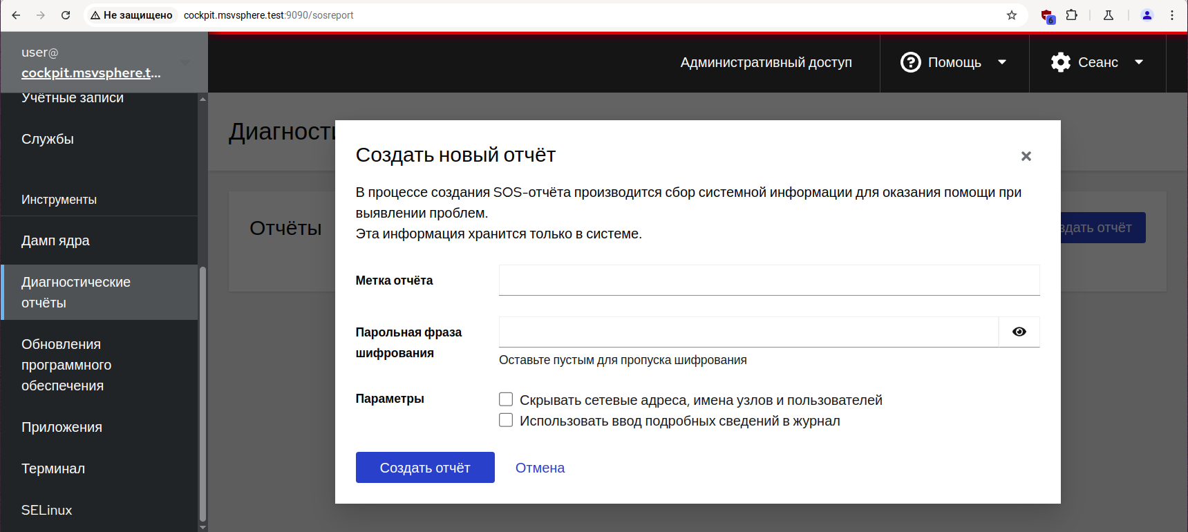 В состав панели управления Cockpit входит модуль для формирования диагностических отчётов, которые затем могут быть переданы для исследования в службу технической поддержки.
