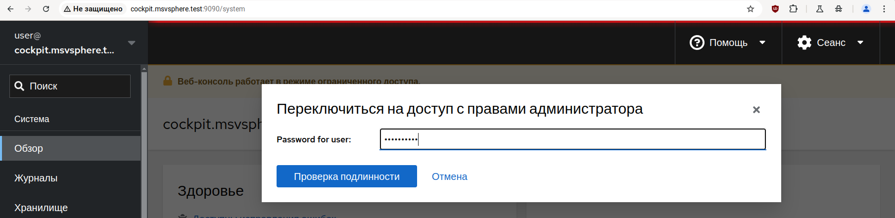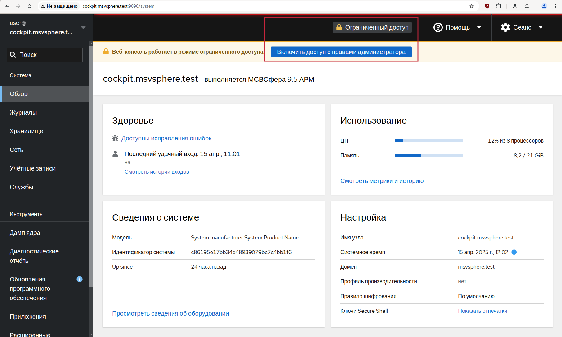 Для настройки мультитерминального режима требуются привилегии администратора: войдите в панель управления Cockpit, на странице «Обзор» нажмите кнопку «Включить доступ с правами администратора» или кнопку «Ограниченный доступ», которая также доступна на других страницах системы управления. На приведённом ниже снимке экрана эти кнопки обозначены красным прямоугольником.