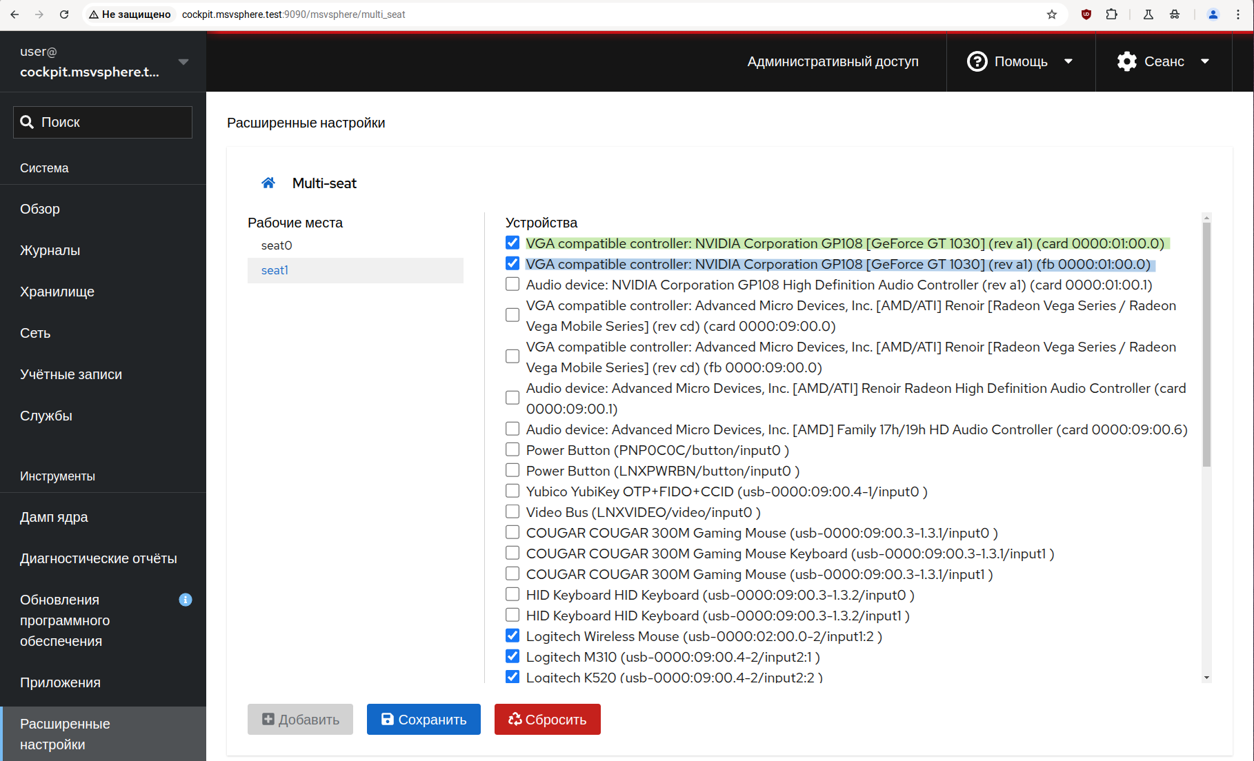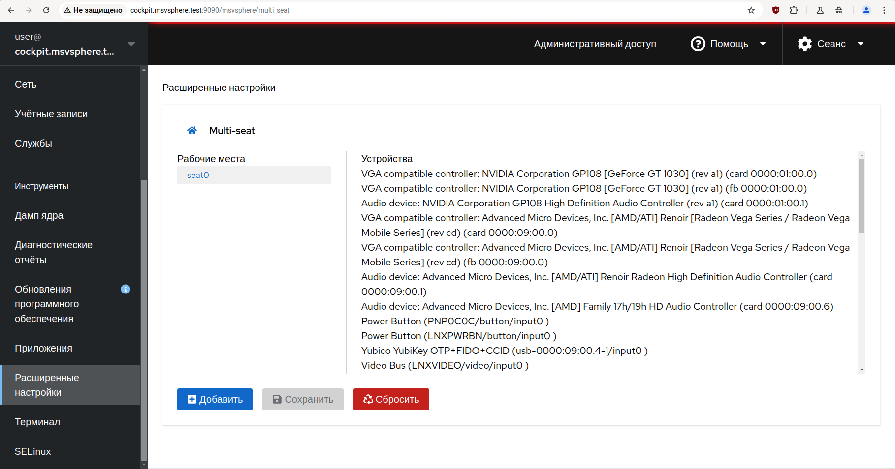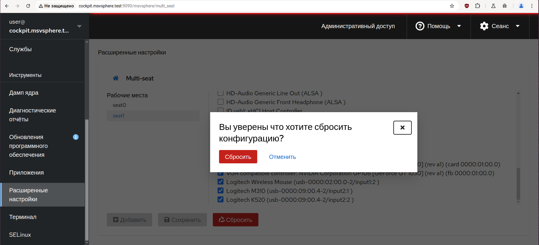 Для возврата системы к базовой конфигурации с одним рабочим местом войдите в панель управления Cockpit, получите привилегии администратора, перейдите на страницу «Расширенные настройки» и выберите там расширение «Multi-seat» как было описано в предыдущем разделе.