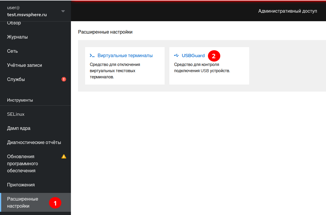 1на снимке экрана), там перейдите по ссылке «USBGuard» (обозначена цифрой2на снимке экрана).