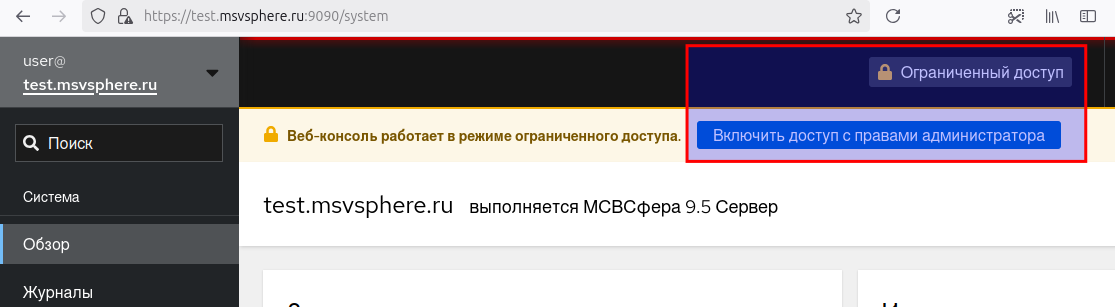 Cockpit. На странице «Обзор» нажмите кнопку «Включить доступ с правами администратора» или кнопку «Ограниченный доступ», которая также доступна на других страницах системы управления. На приведённом ниже снимке экрана эти кнопки выделены красным.