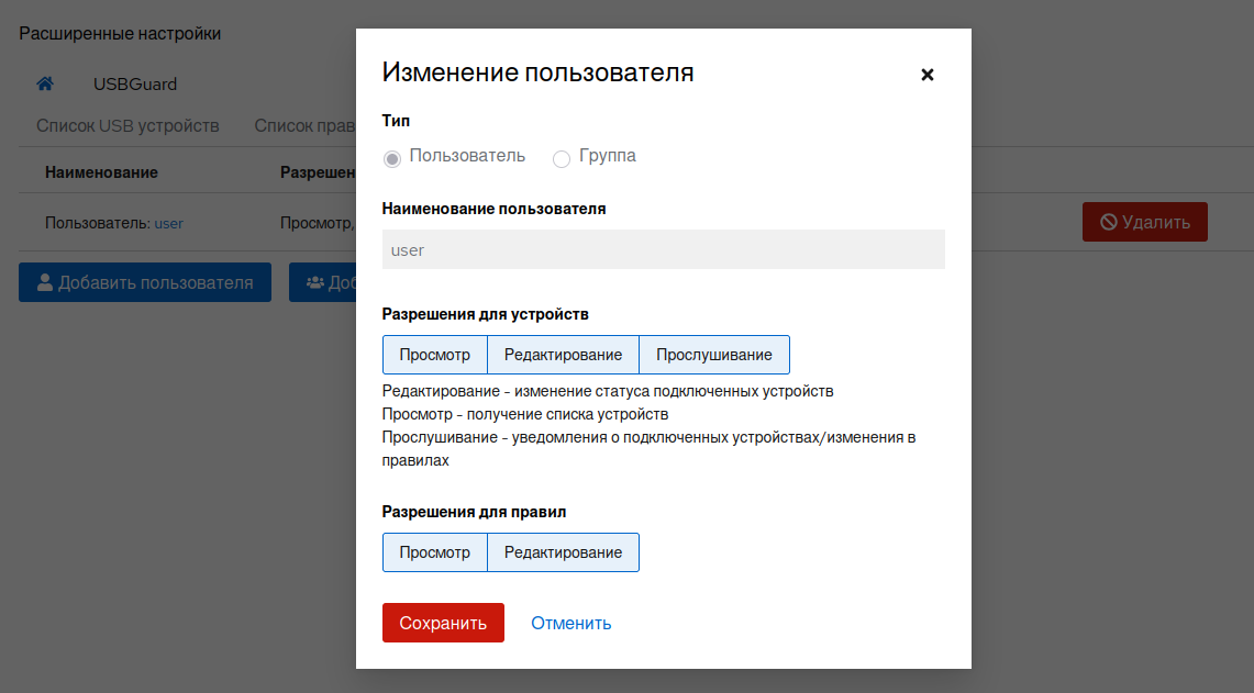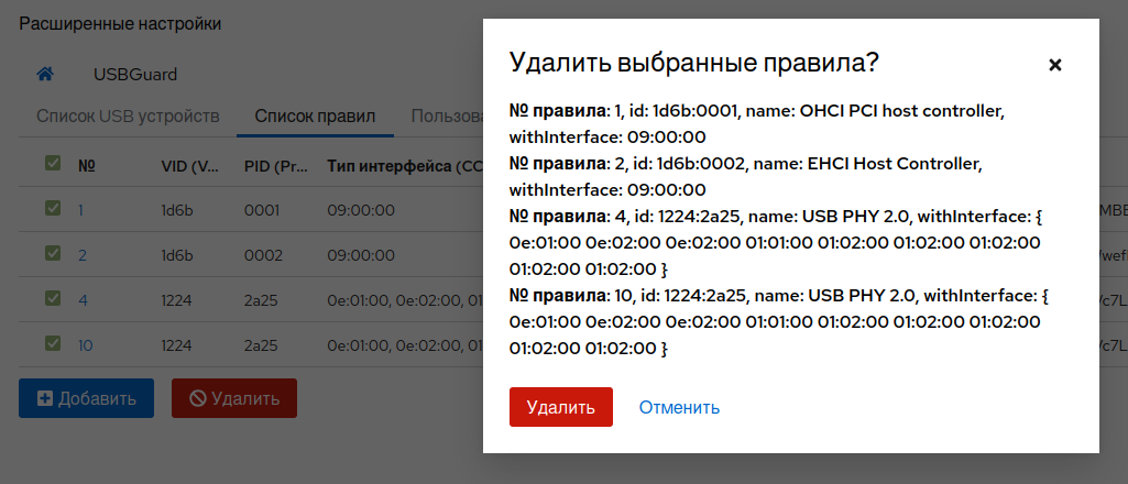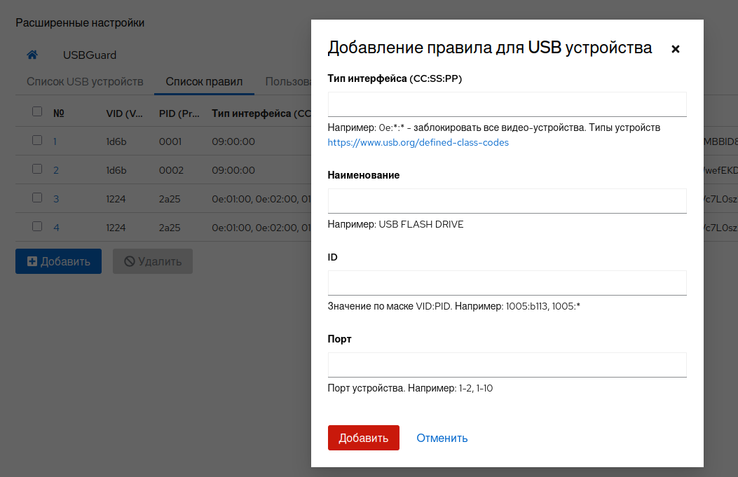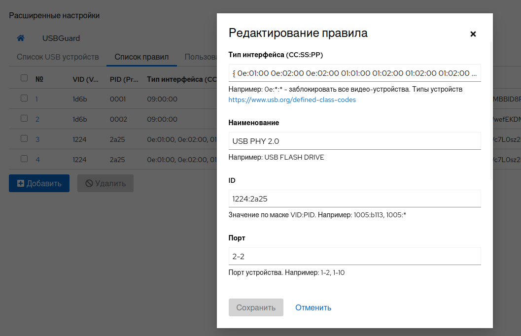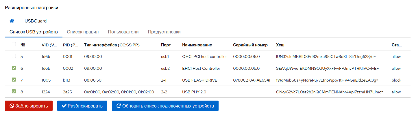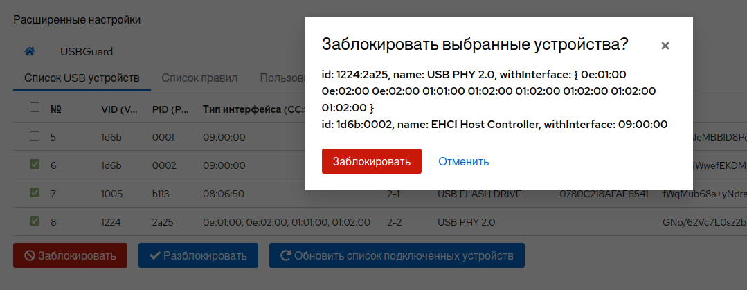 После сохранения изменений сервис usbguard будет перезапущен.