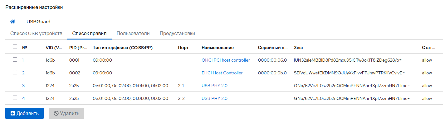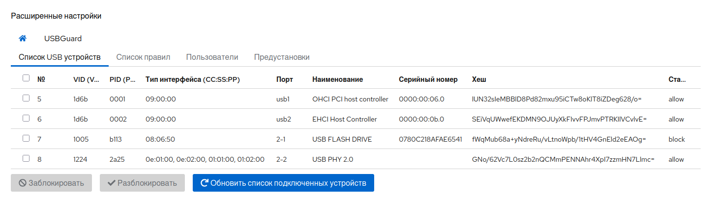 После запуска сервиса usbguard в «белый» список добавятся все текущие подключённые устройства.