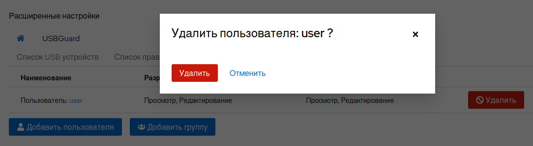 Для удаления пользователя/группы нажмите на кнопку «Удалить» в таблице пользователей и подтвердите действие.