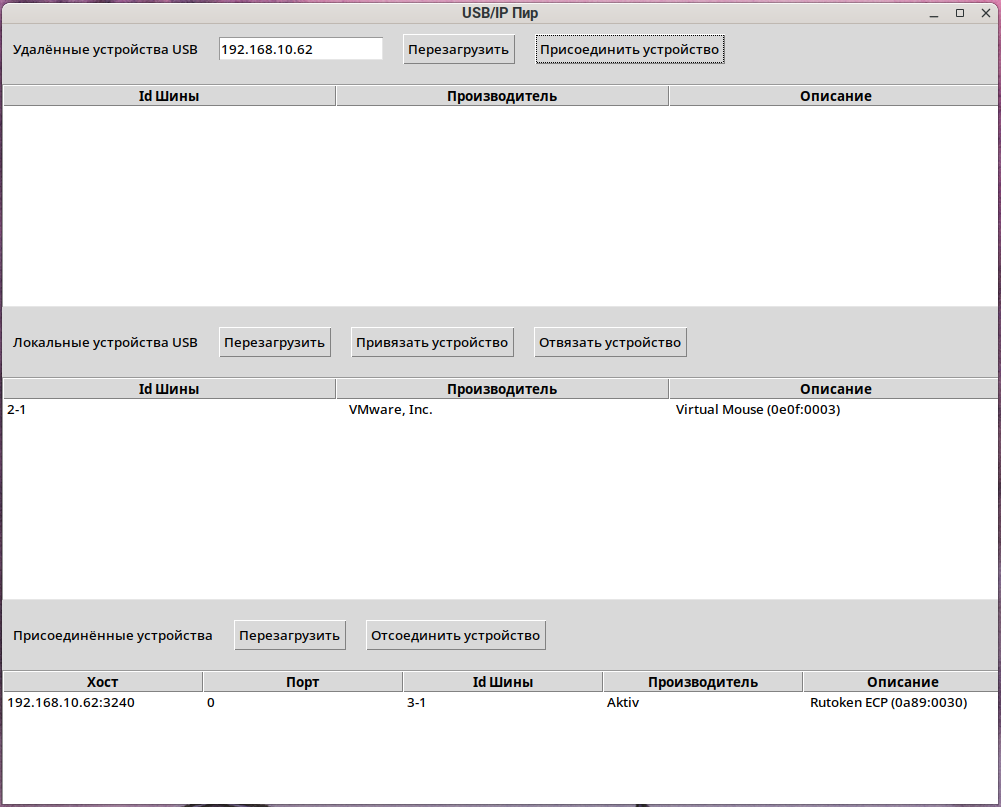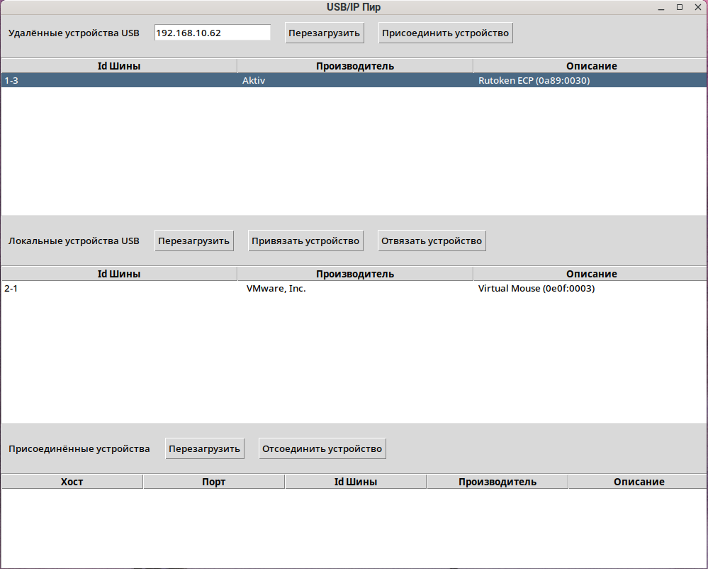 Для подключения устройства с помощью графического интерфейса запустите утилиту «Управление USBIP», введите адрес сервера в поле «Удалённые устройства USB» и нажмите кнопку «Перезагрузить». После этого устройство должно появиться в списке доступных. Для подключения устройства выделите его и нажмите кнопку «Присоединить устройство».