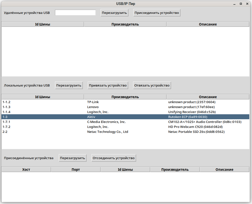 Эту же операцию можно выполнить при помощи графического интерфейса. Для этого запустите утилиту «Управление USBIP» из главного меню. В разделе «Локальные устройства USB» найдите нужное устройство, выделите его и нажмите кнопку «Привязать устройство». Для отключения устройства выделите устройство и нажмите кнопку «Отвязать устройство».