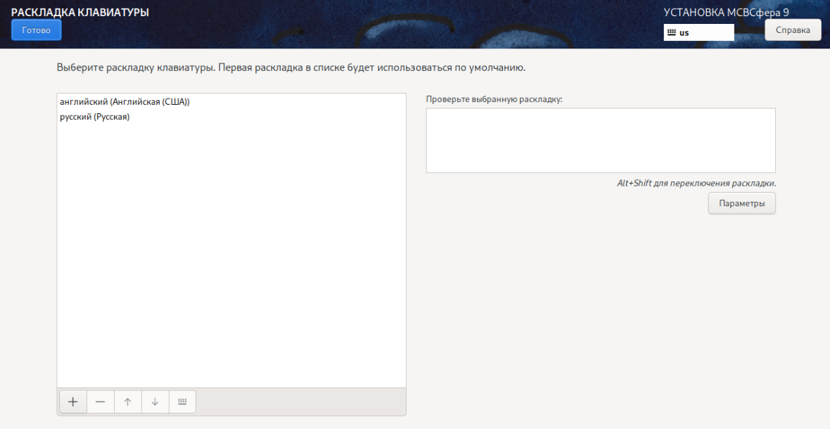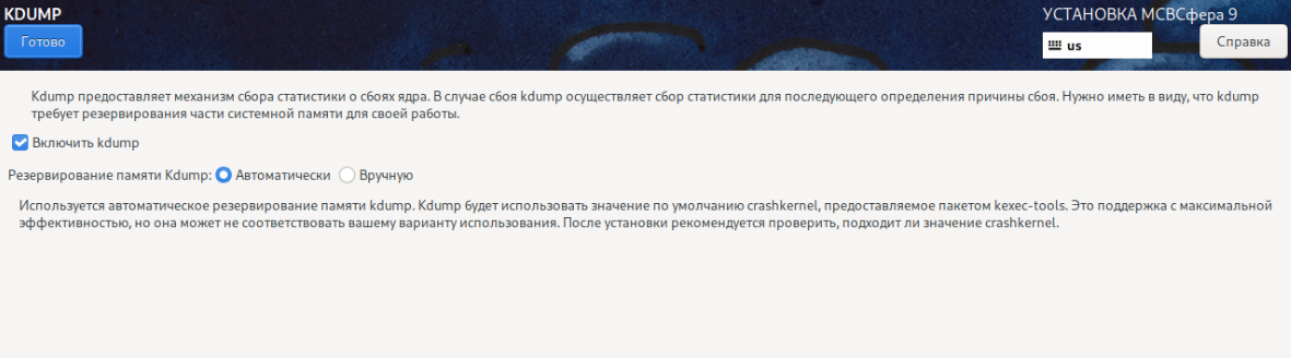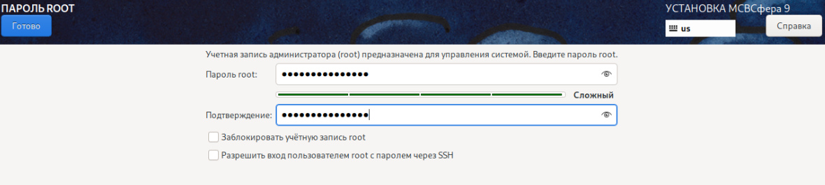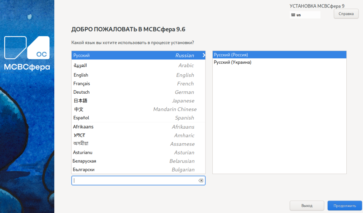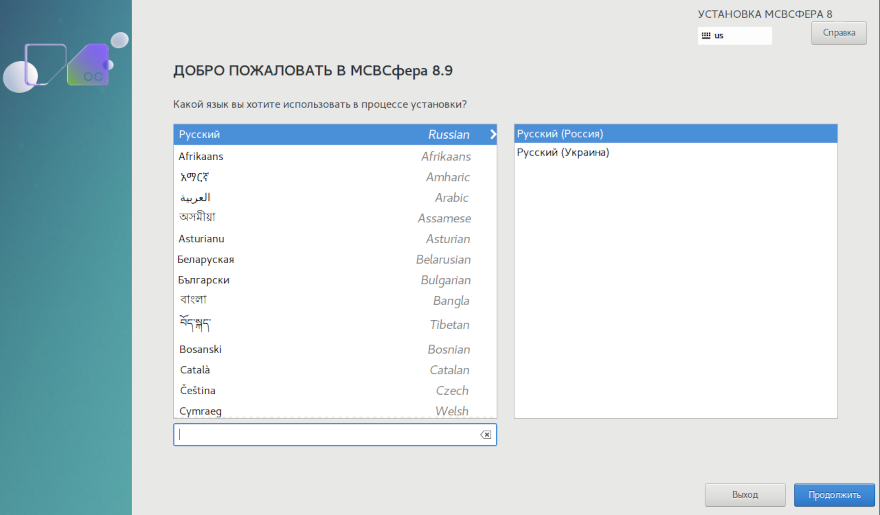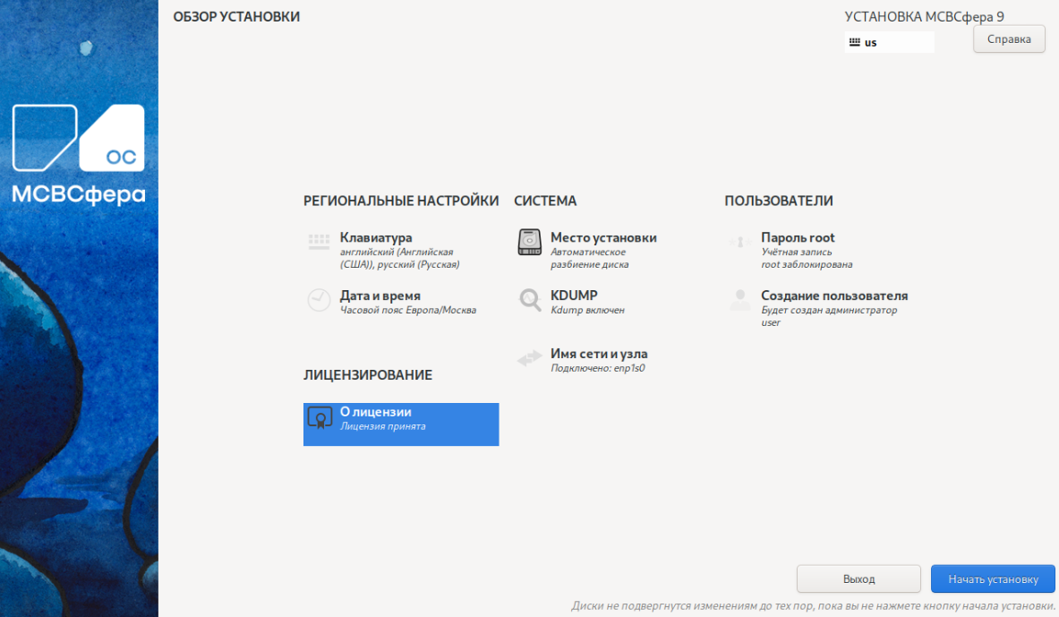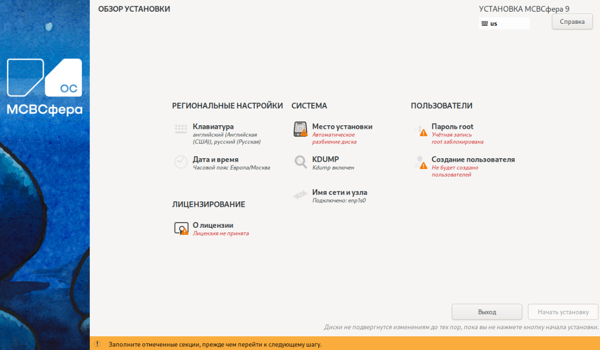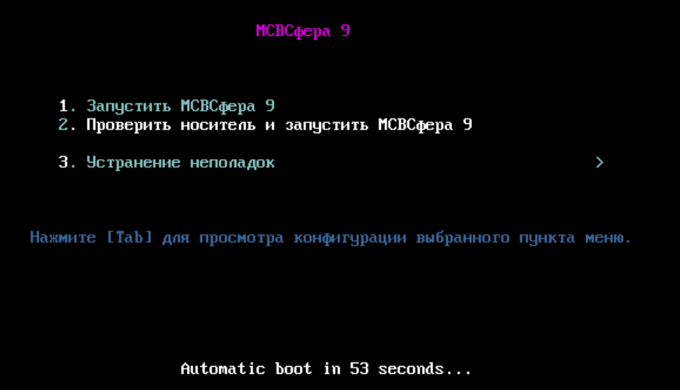 Устранение неполадок — вы сможете перейти в режим восстановления, который представляет собой минимальную среду МСВСфера 9, загружаемую с загрузочного носителя. В этом режиме используются утилиты командной строки, с помощью которых вы можете монтировать или не монтировать файловые системы, заносить в чёрный список и добавлять драйверы, устанавливать и обновлять системные пакеты, а также управлять разделами.