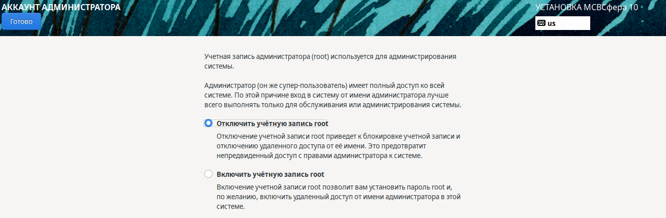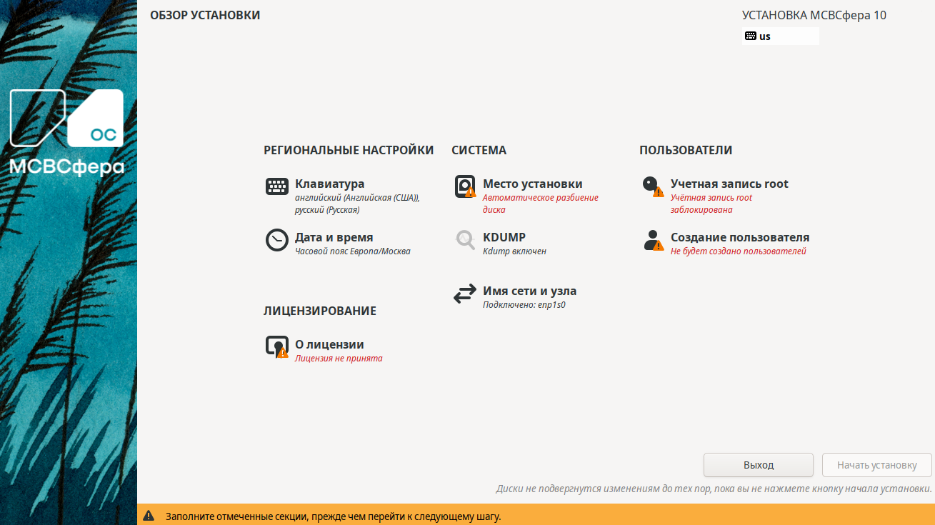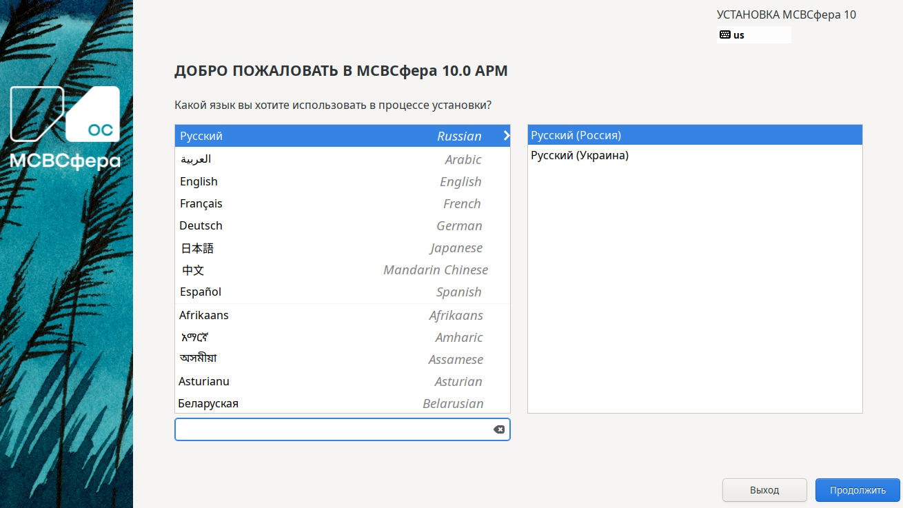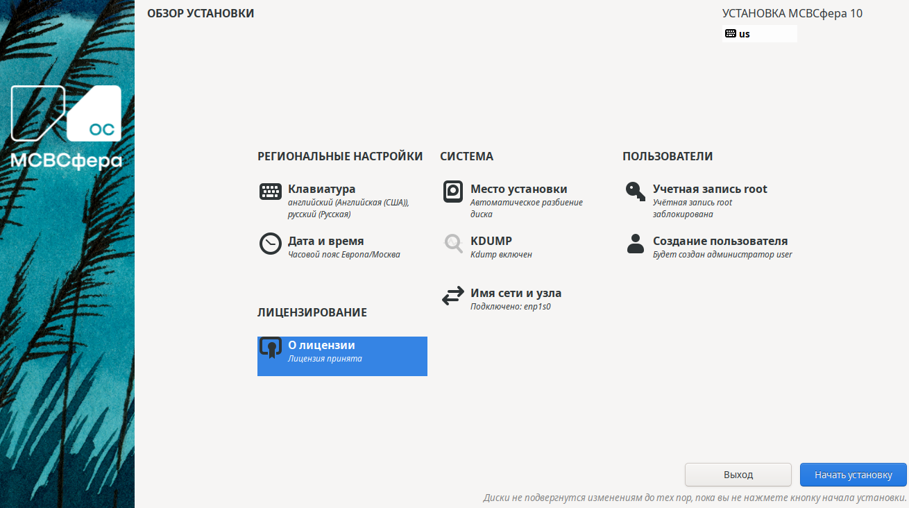 Устранение неполадок — вы сможете перейти в режим восстановления, который представляет собой минимальную среду МСВСфера 10, загружаемую с загрузочного носителя. В этом режиме используются утилиты командной строки, с помощью которых вы можете монтировать или не монтировать файловые системы, заносить в чёрный список и добавлять драйверы, устанавливать и обновлять системные пакеты, а также управлять разделами.
