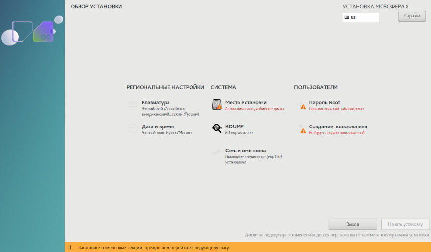 Устранение неполадок — вы сможете перейти в режим восстановления, который представляет собой минимальную среду МСВСфера 8, загружаемую с загрузочного носителя. В этом режиме используются утилиты командной строки, с помощью которых вы можете монтировать или не монтировать файловые системы, заносить в чёрный список и добавлять драйверы, устанавливать и обновлять системные пакеты, а также управлять разделами.