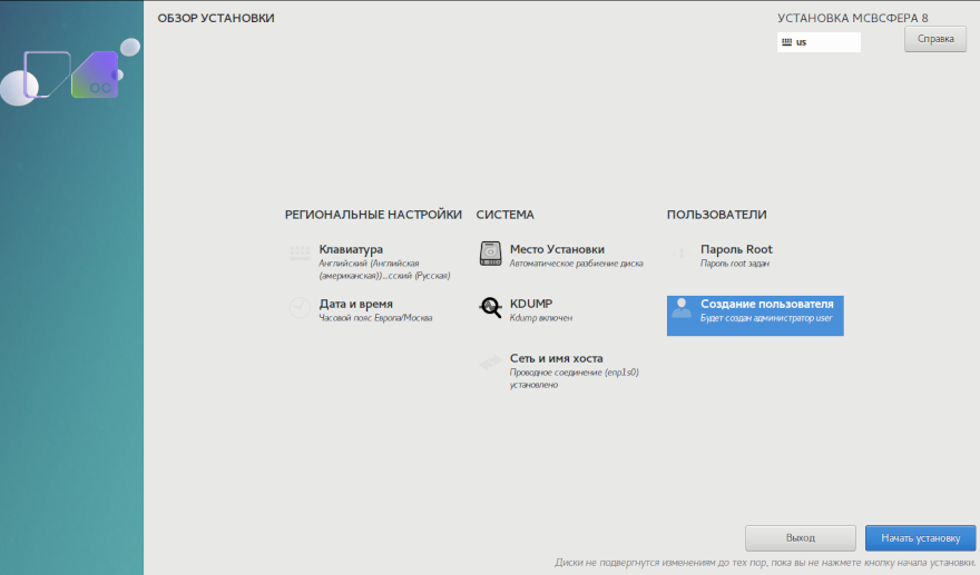 После того как все необходимые настройки произведены, нажмите на кнопку «Начать установку», и процесс установки начнётся.