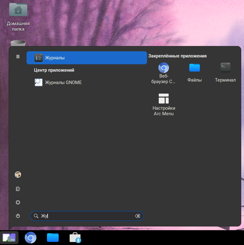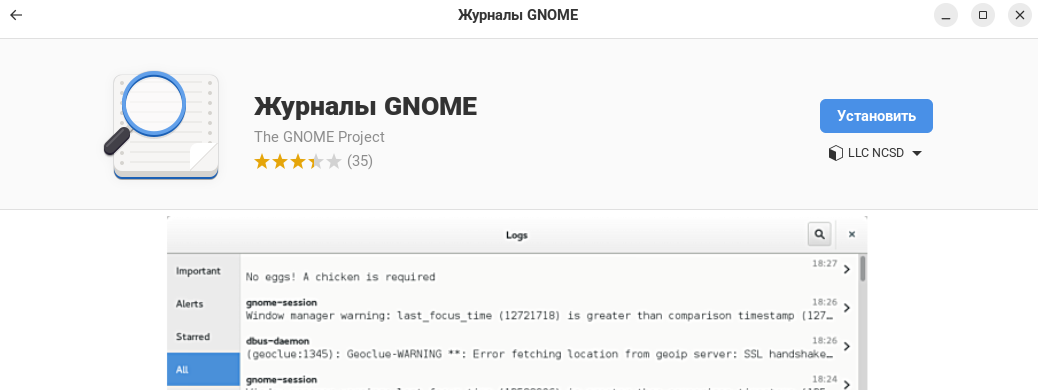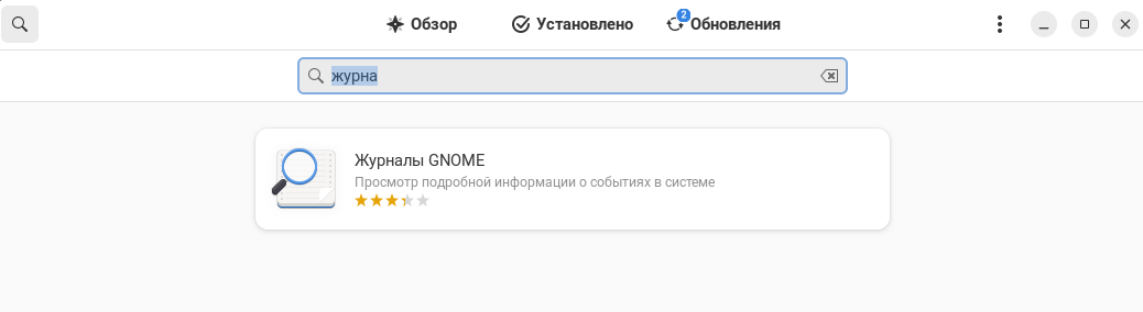 Если приложение не установлено по умолчанию, его можно установить из «Центра приложений». Для этого перейдите в «Центр приложений» любым удобным способом и в строке поиска наберите «Журналы GNOME», нажмите правой клавишей мыши на найденное приложение, вы перейдёте на страницу приложения.