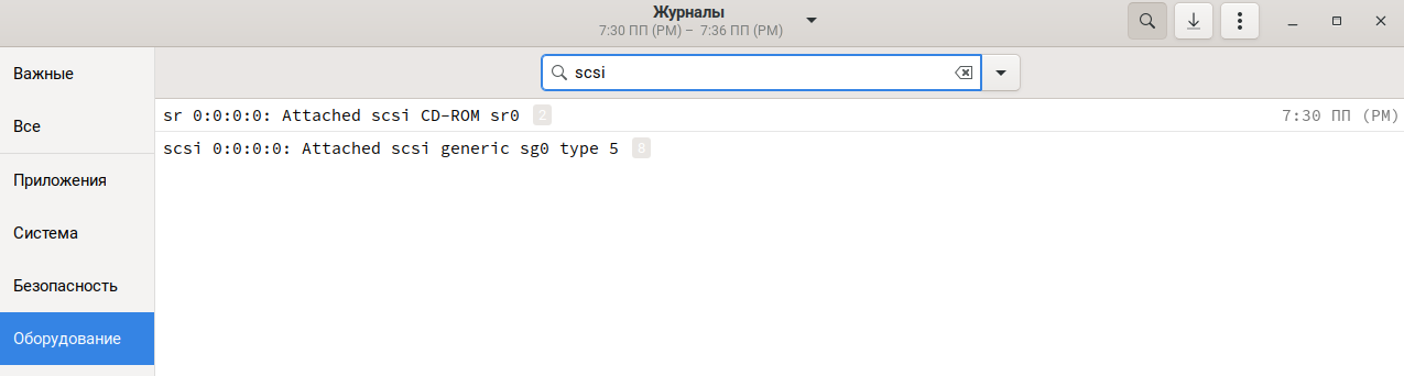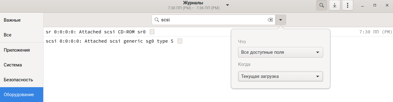 В строке поиска укажите ключевое слово, по которому будет осуществляться поиск — это может быть тип события, например, «error» или «warning», или же идентификатор устройства, например, «scsi».