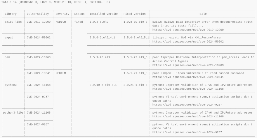 В результате выполнения Trivy выдаст таблицу со списком всех обнаруженных уязвимостей. Формат вывода результатов можно настроить с помощью аргумента --format, для просмотра списка поддерживаемых форматов и других опций выполните команду trivy image --help.