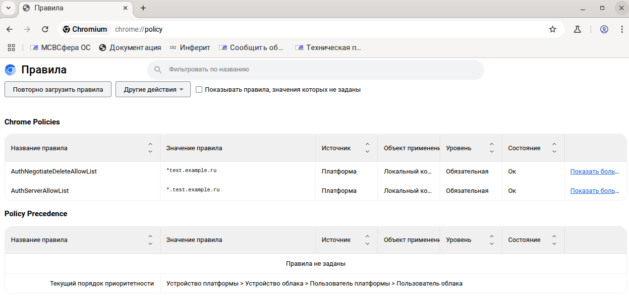 Теперь вы можете посмотреть созданные политики в браузере Chromium по адресу