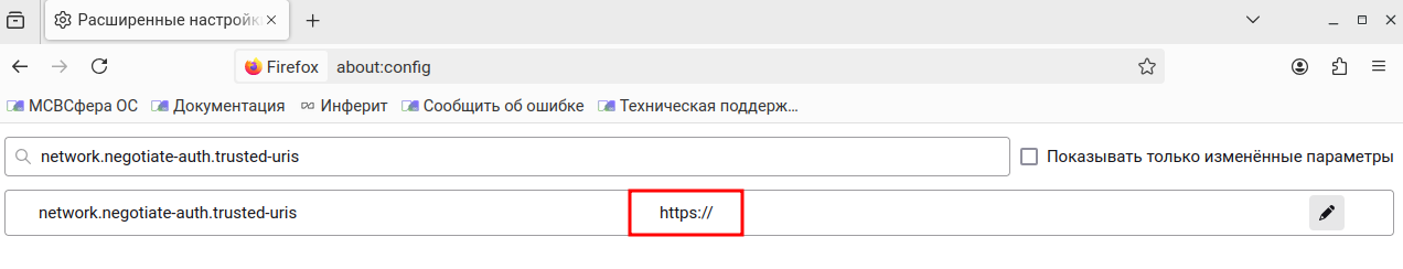 В ОС МСВСфера в браузере Mozilla Firefox аутентификация Kerberos/SSO разрешена по умолчанию для всех доменов.