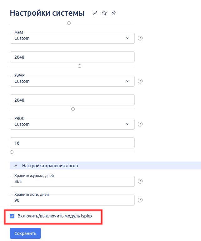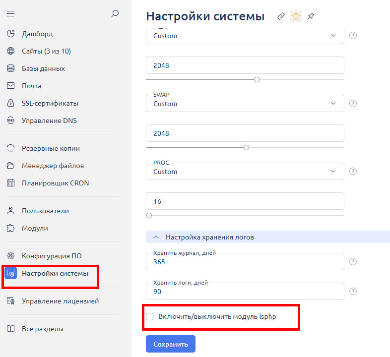 После установки необходимых пакетов с помощью модуля ОС МСВСфера 9 через интерфейс ispmanager или через командную строку, необходимо зайти в пункт Настройки системы и там включить флажок Включить/выключить модуль lsphp.