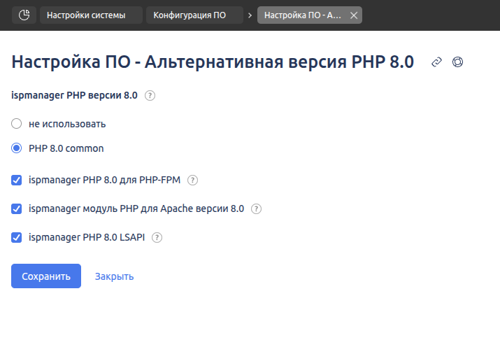 Apacheвыберите “Не использовать”, т.к. прямой переход отITKкPreforkсовершить нельзя. После того, как переконфигурация ПО завершится, выберите “Apache MPM-Prefork”, а также поставьте галочки напротив пунктов “Модуль PHP” и “PHP-FPM FastCGI”.Нажмите “Сохранить”.