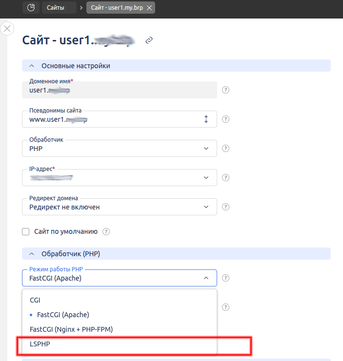 С этого моента сайт пользователя будет работать под управлением LSPHP: