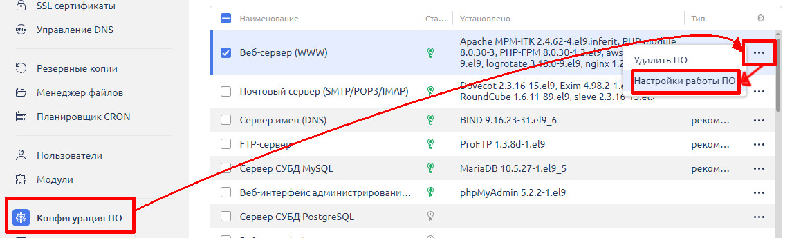 Перейдите в настройку “Конфигурация ПО” и выберите “Веб-сервер (WWW)”, затем “Настройка работы ПО”.