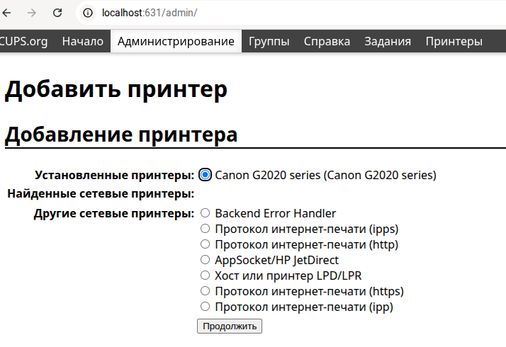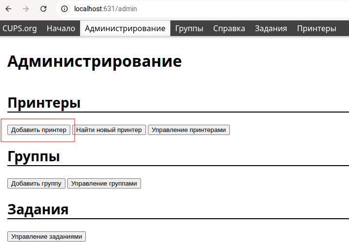 Панель управления доступна в браузере по адресу http://localhost:631.