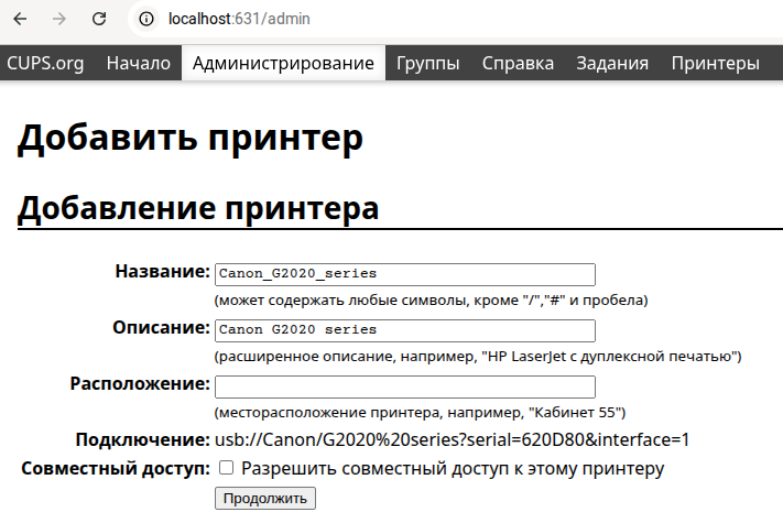 При необходимости заполните поля: «Название», «Описание», «Расположение». При необходимости включите опцию «Разрешить совместный доступ к этому принтеру» и нажмите «Продолжить».