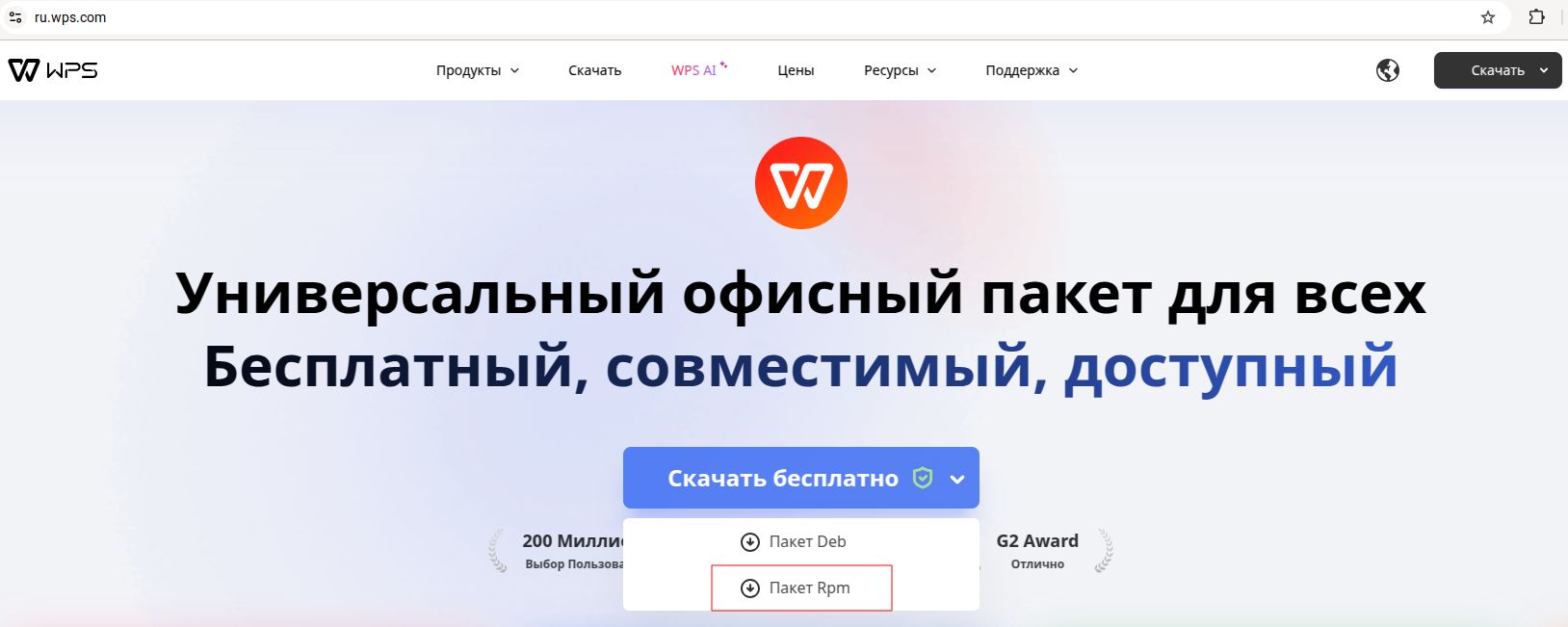 Перейдите на Официальный сайт WPS Office и скачайте RPM пакет: