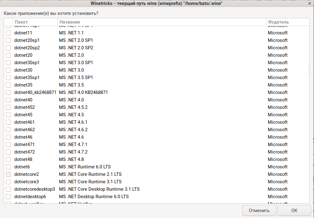 Для установки пакета в графическом режиме необходимо запустить winetricks.
