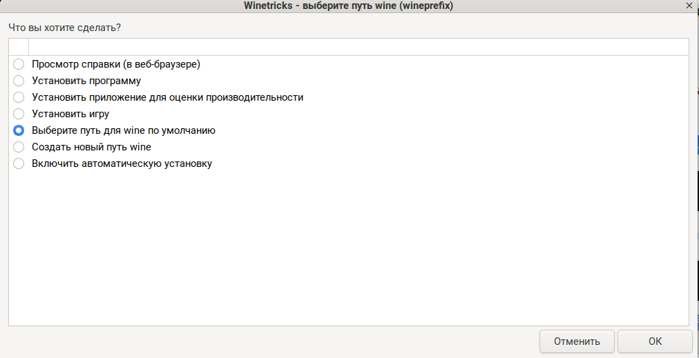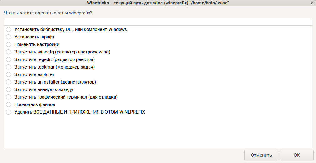 При выборе пункта меню, установленного по умолчанию, открывается следующее окно, которое содержит список доступных над wine-префиксом операций, где можно доустановить библиотеки, шрифты, вызвать редактор реестра или окно настроек wine (winecfg).