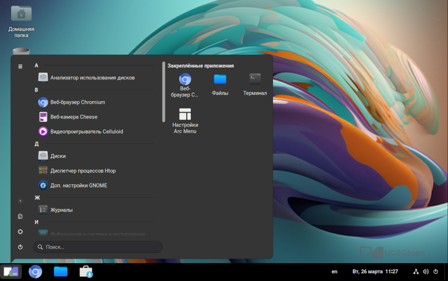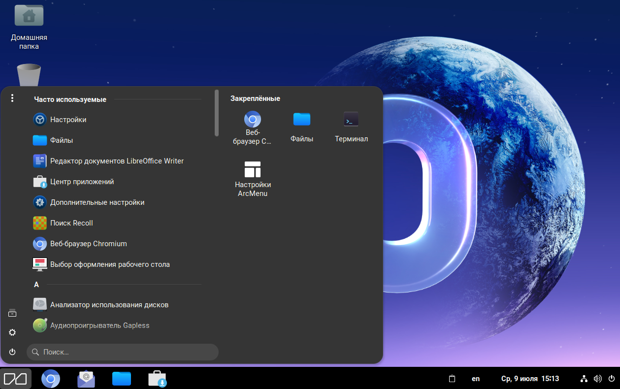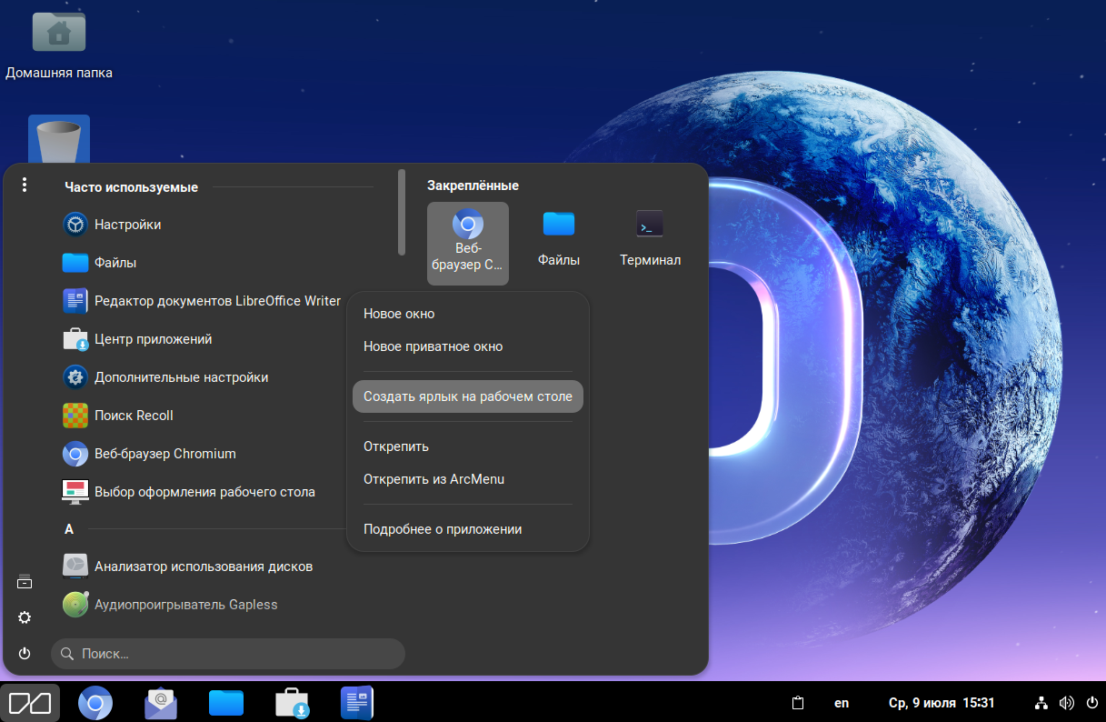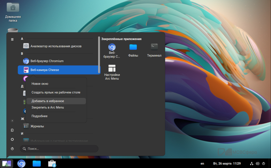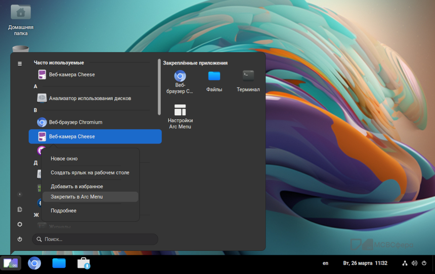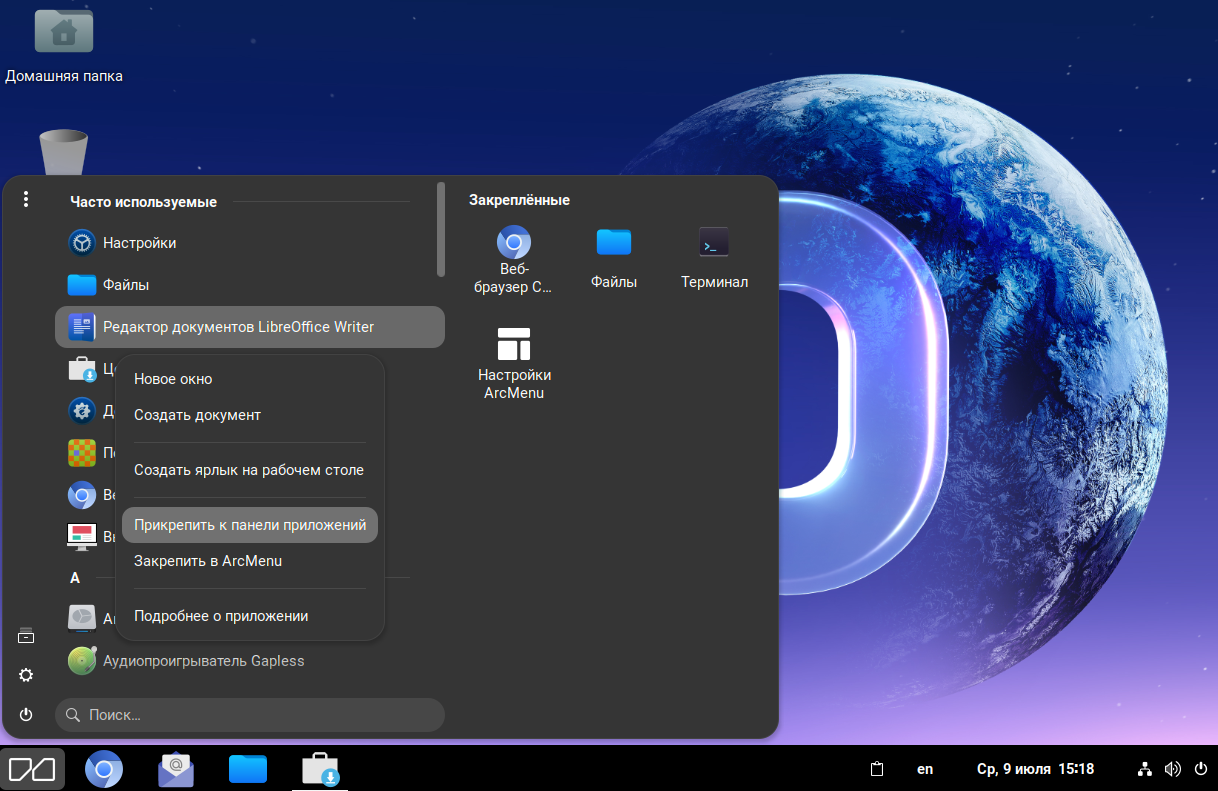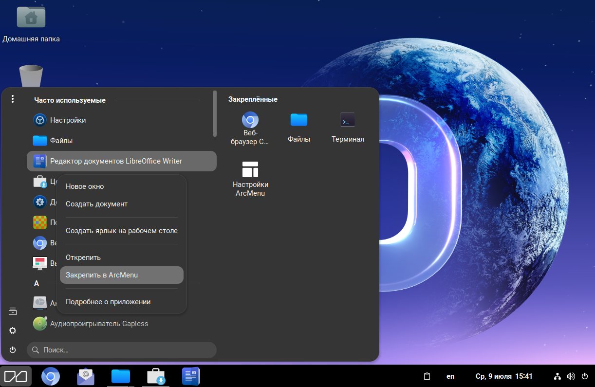 Вы также можете закрепить приложение в ArcMenu, в этом случае при открытии меню «Приложения» закреплённые приложения отображаются в правой части меню.