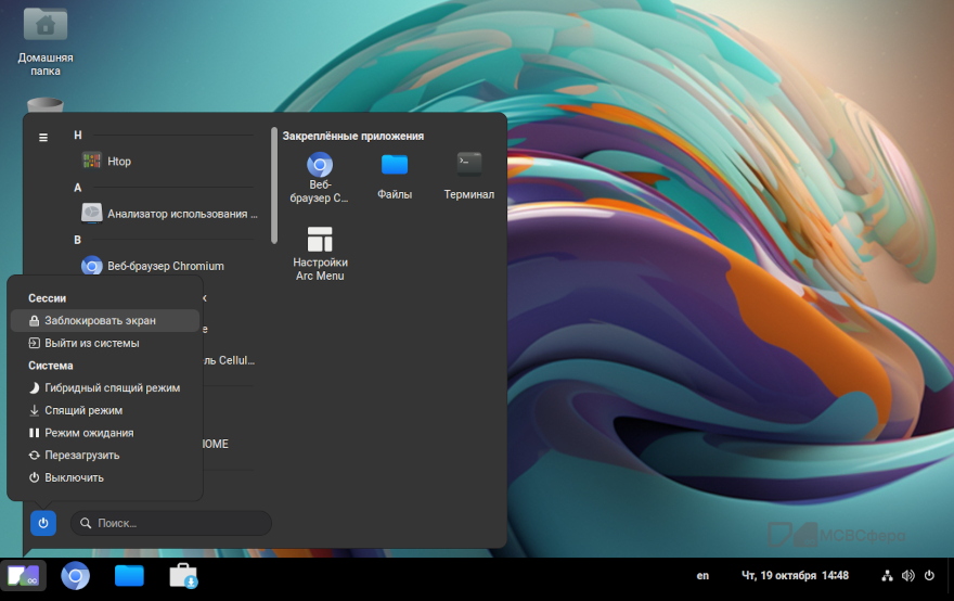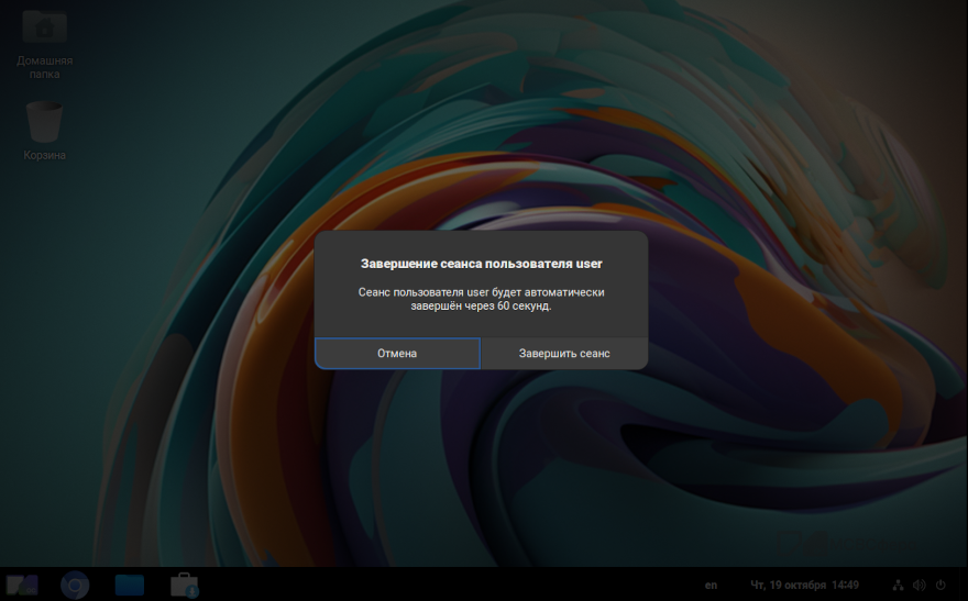 Завершение сеанса работы пользователя с системой осуществляется нажатием в системном меню на имя пользователя и выбором «Завершить сеанс»: