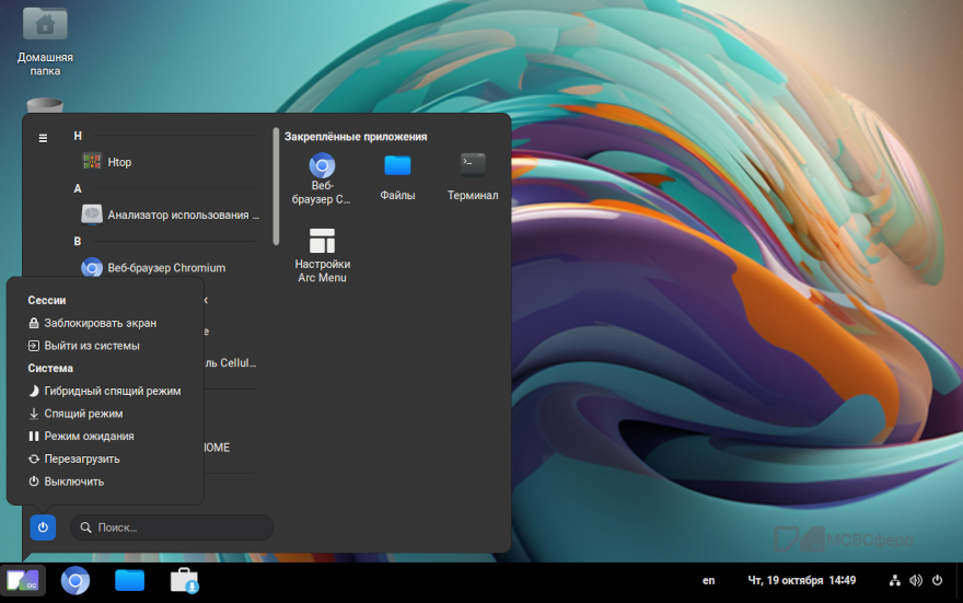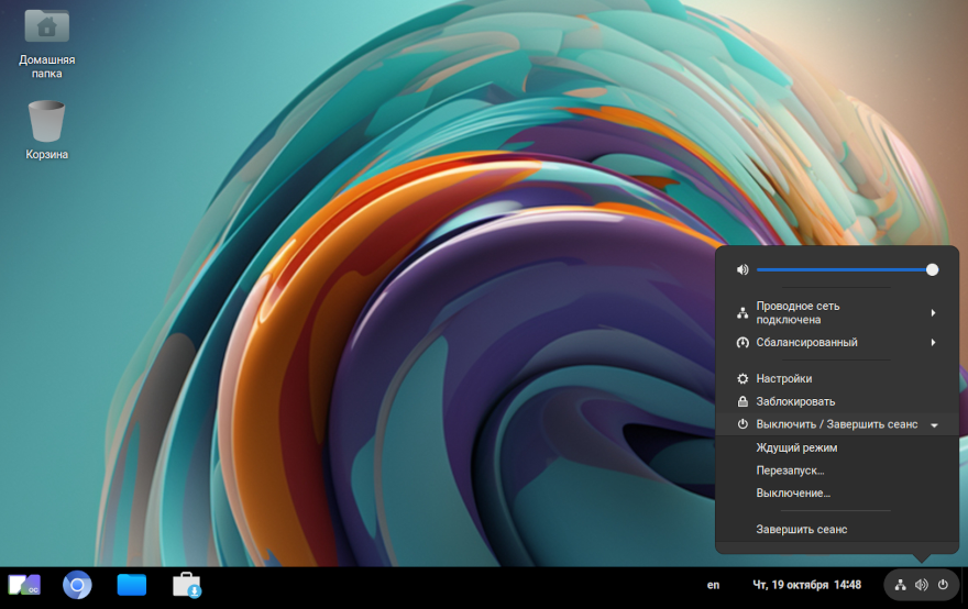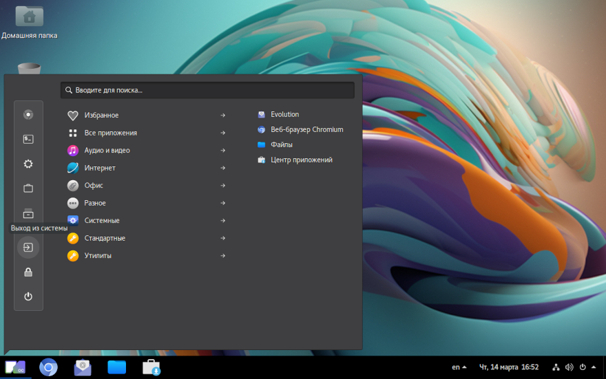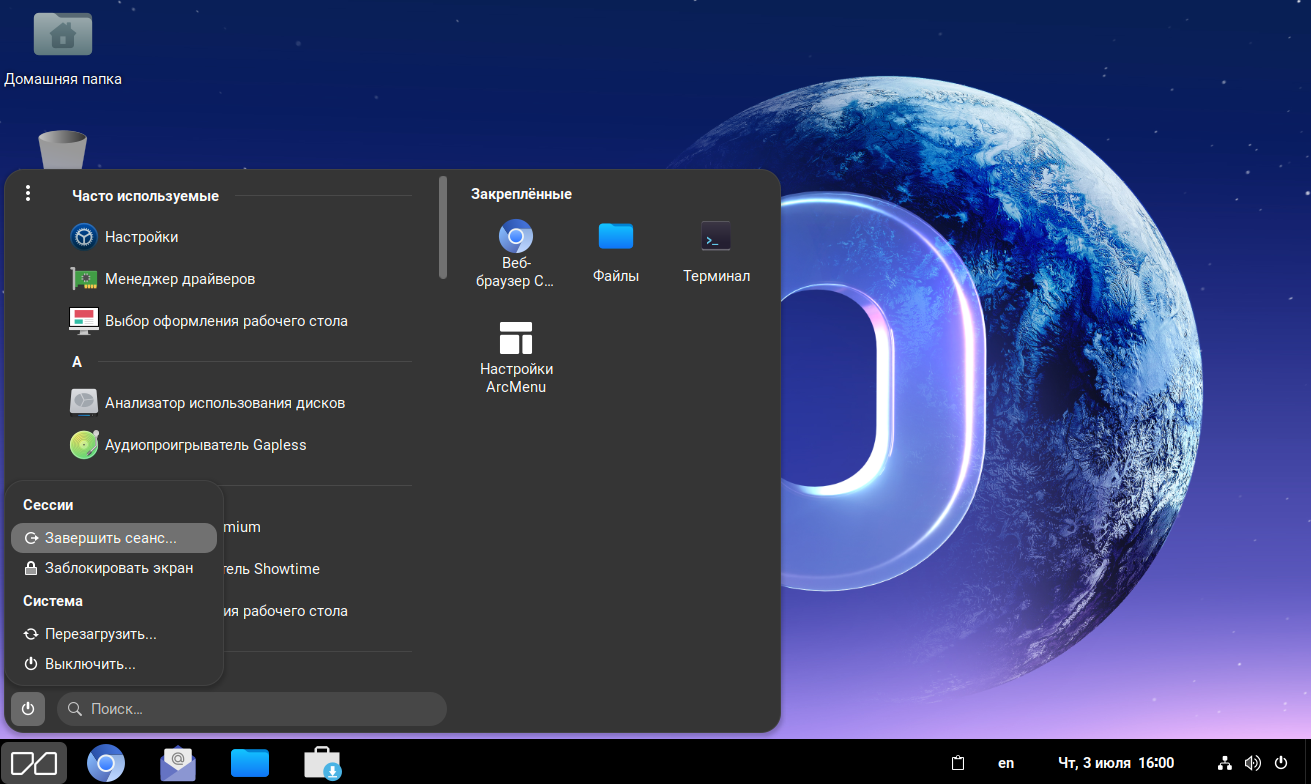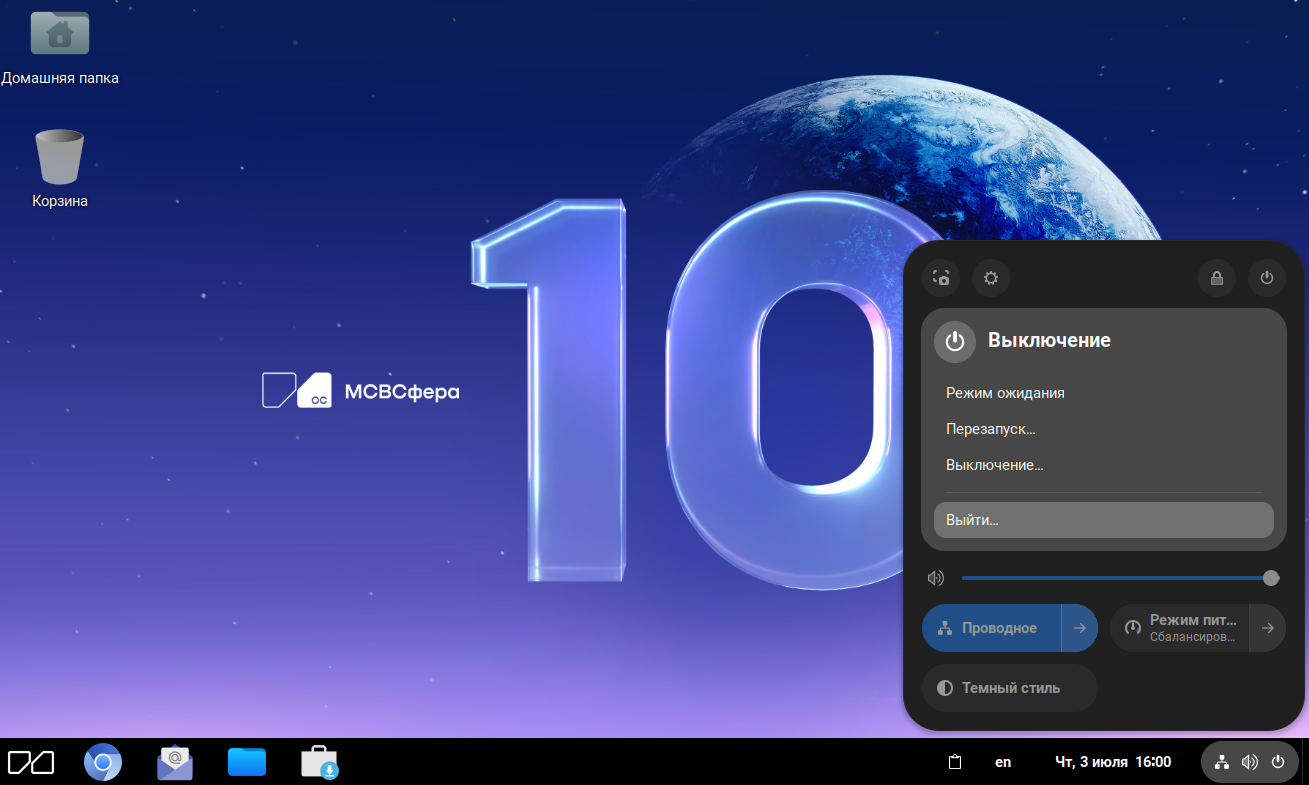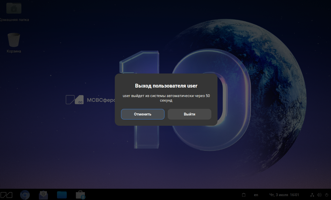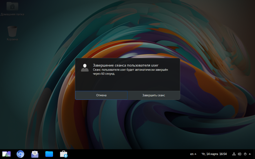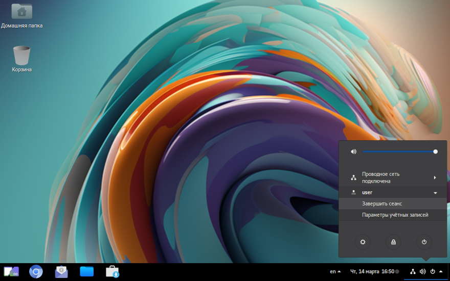 Завершение сеанса работы пользователя с системой осуществляется нажатием в системном меню на значок выключения и выбором «Выйти».