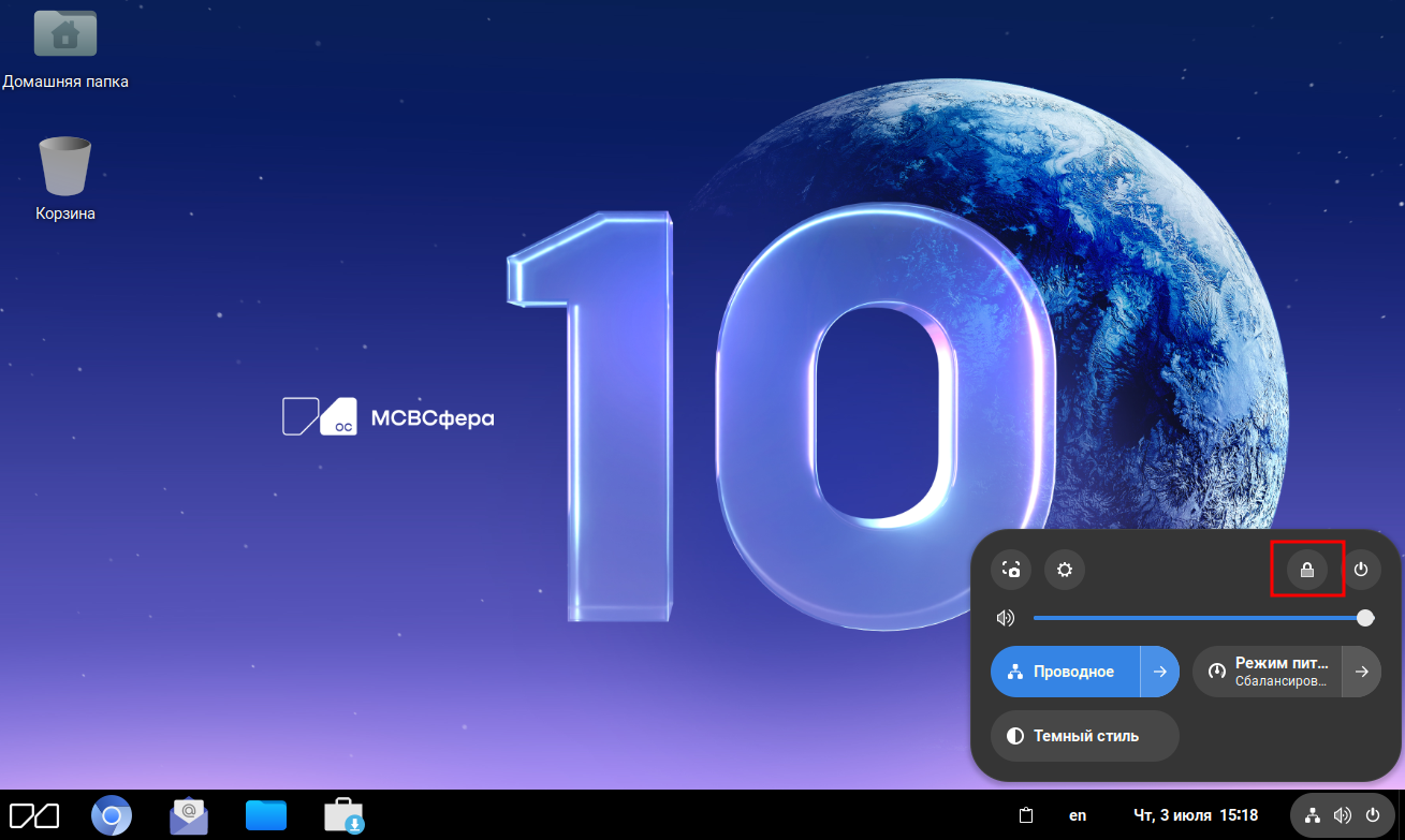 Блокировка экрана осуществляется нажатием в системном меню «Заблокировать» (путем наведения на нее курсора и нажатия кнопки мыши):