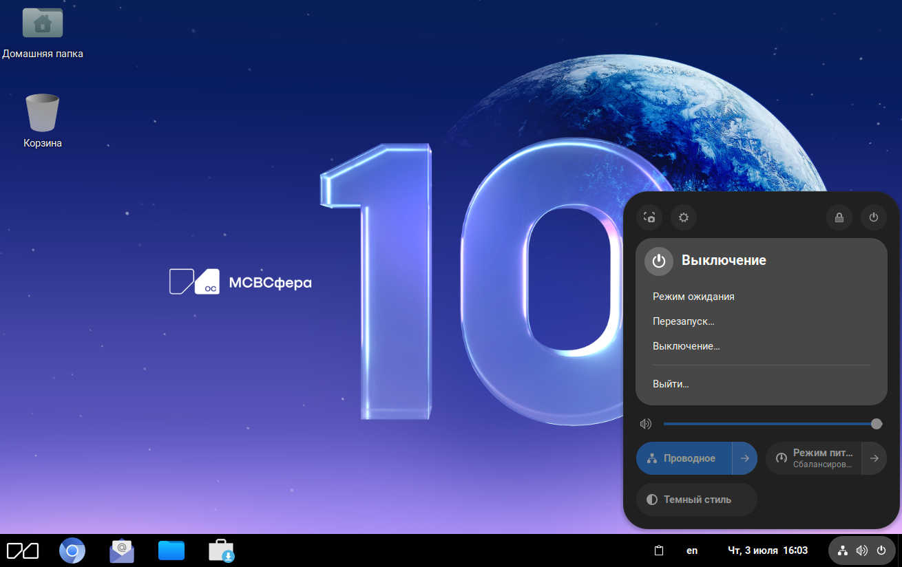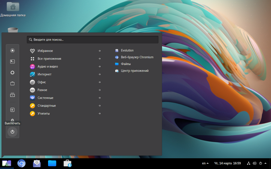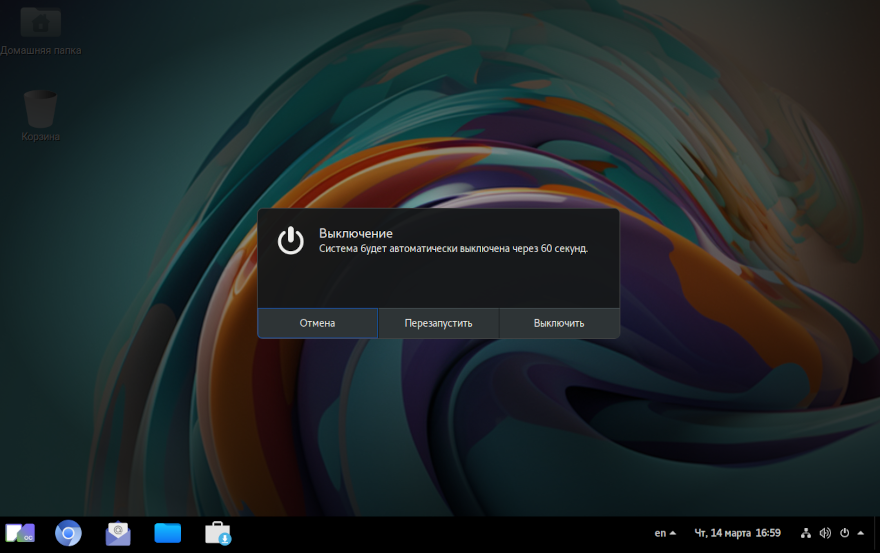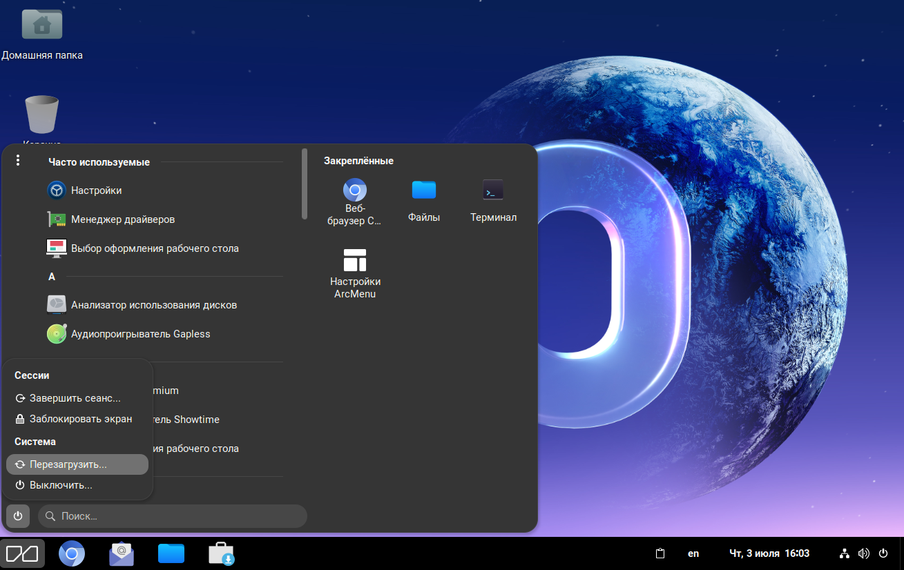 Перезапуск и выключение системы осуществляются нажатием в системном меню на «Выключить»: