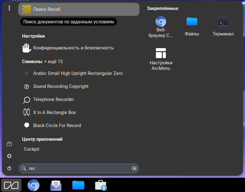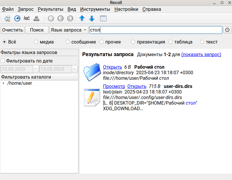 Поиск по содержимому файлов в каталоге собственных документов пользователя (например по слову в названии файла, по тексту в документе) в МСВСфера ОС осуществляется с помощью приложения «Recoll».