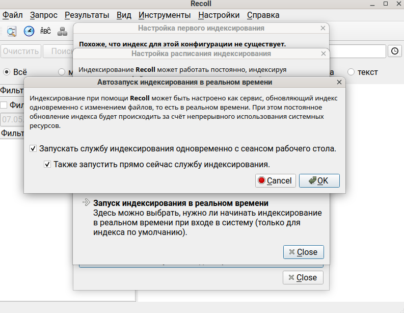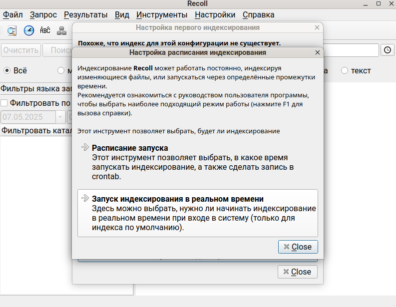 При первом запуске откроется окно «Настройка первого индексирования» и вам будет предложено выбрать расписание индексирования.